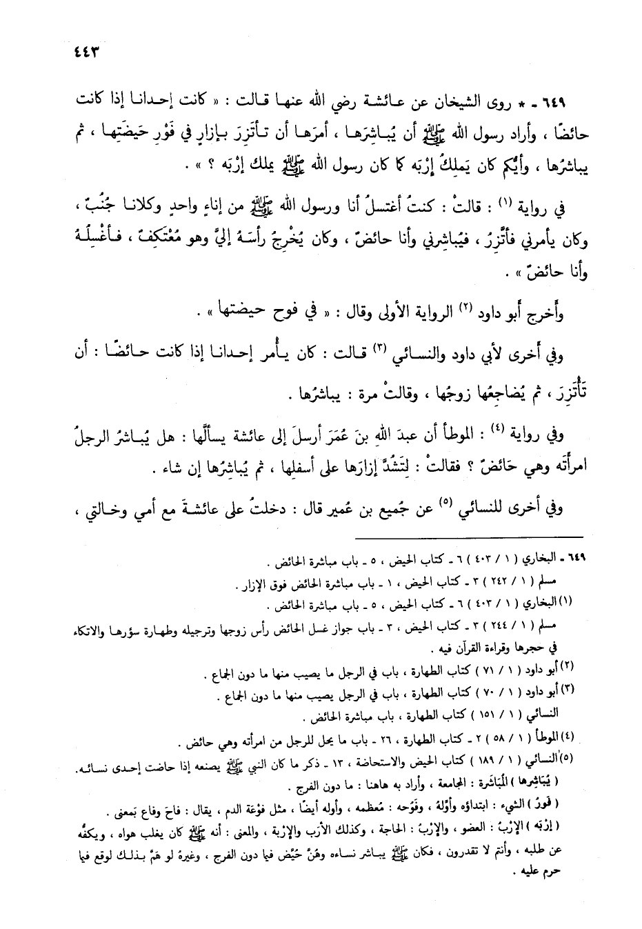 649 - * روى الشخيان عن عائشة رضي الله عنها قالت: "كانت إحدانا إذا كانت حائضاً، وأراد رسول الله صلى الله عليه وسلم أن يباشرها، أمرها أن تأتزر بإزارٍ في فوْرِ حيضتها، ثم يباشرها، وأيُّكم كان يملك إربه كما كان رسول الله صلى الله عليه وسلم يملك إرْبَه؟ ".