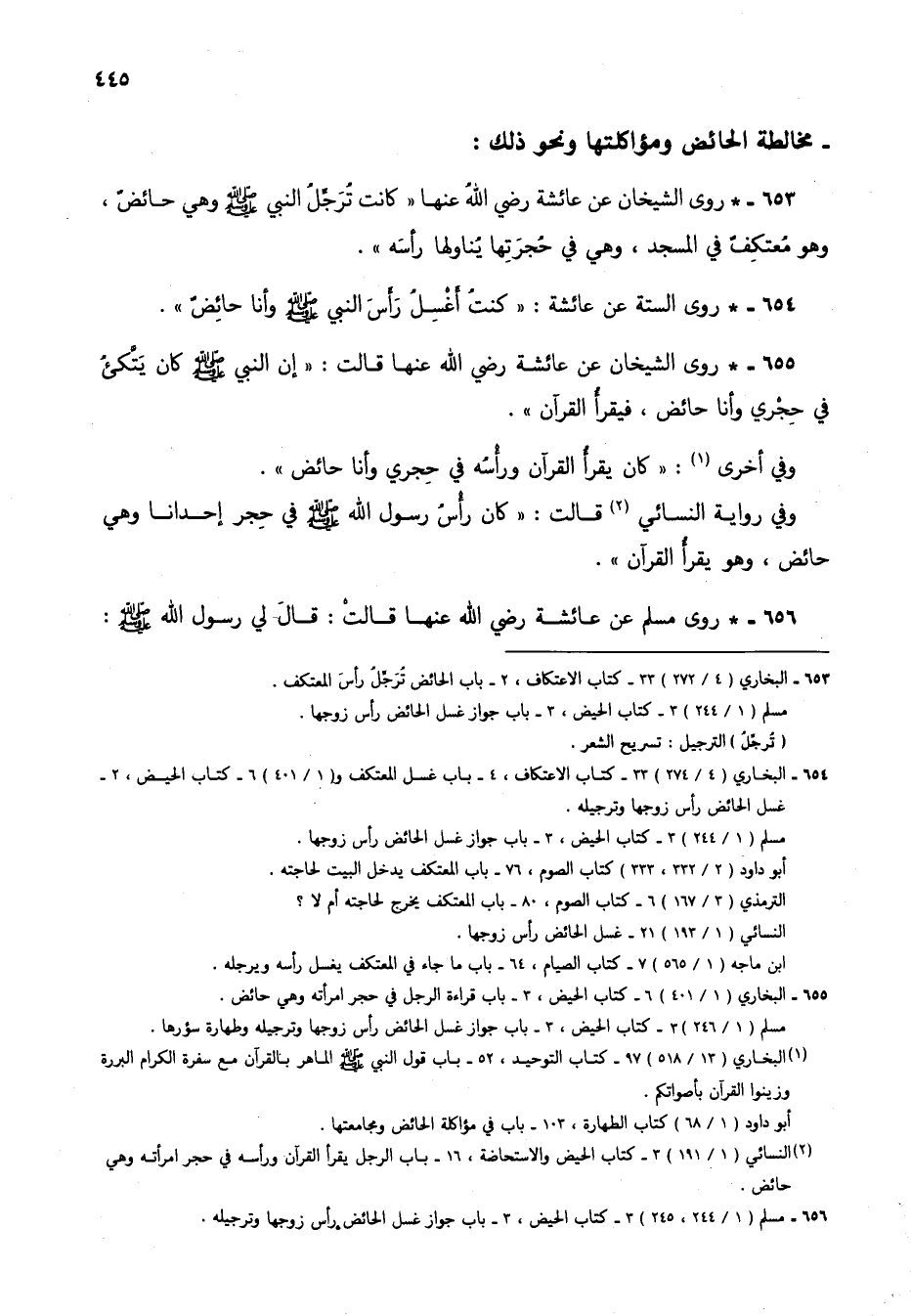 655 - * روى الشيخان عن عائشة رضي الله عنها قالت: "إن النبي صلى الله عليه وسلم كان يتكئ في حجري وأنا حائض، فيقرأُ القرآن".