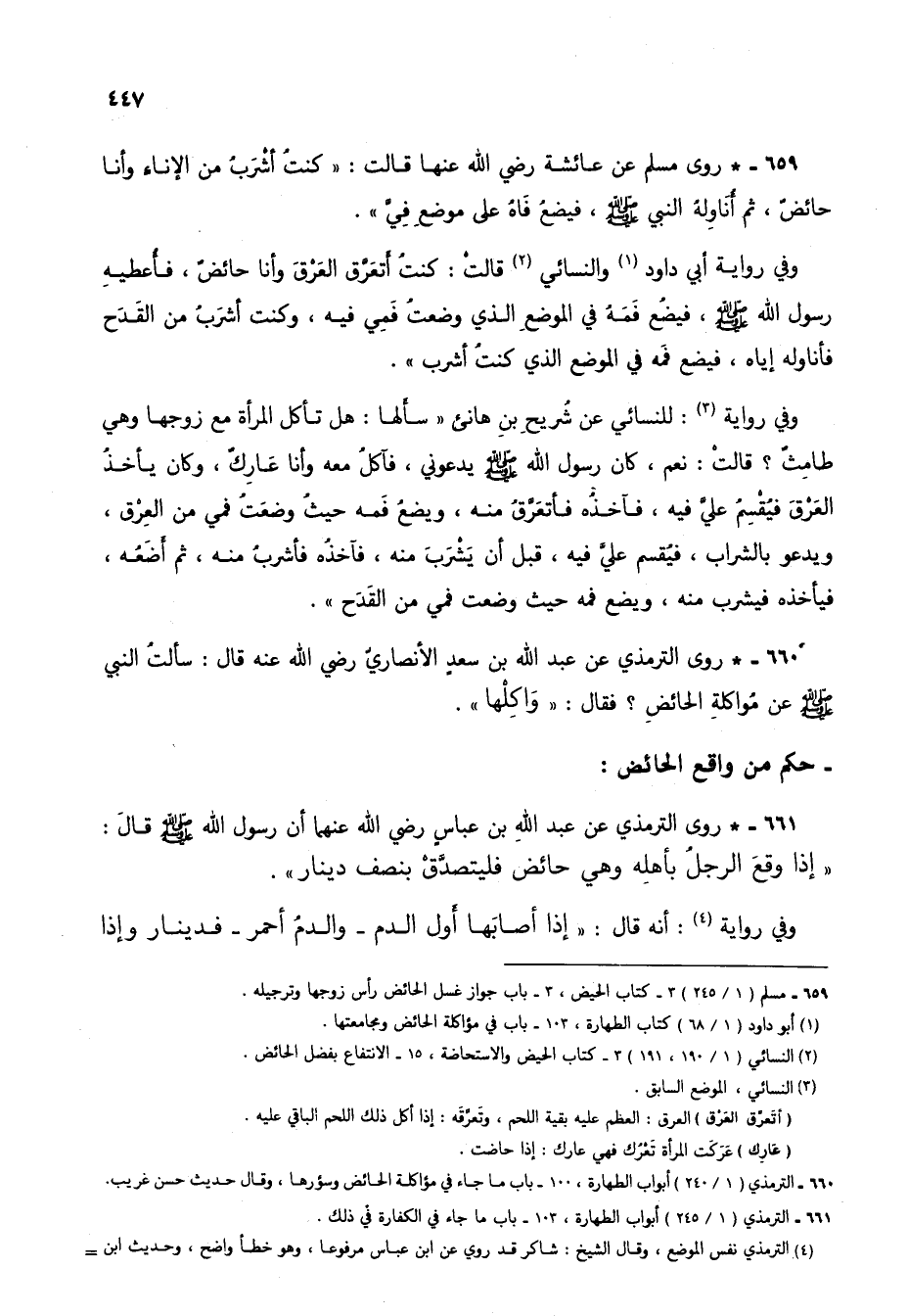 659 - * روى مسلم عن عائشة رضي الله عنها قالت: "كنت أشربُ من الإناء وأنا حائضٌ، ثم أناوله النبي صلى الله عليه وسلم فيضعُ فاهُ على موضع فيِّ".