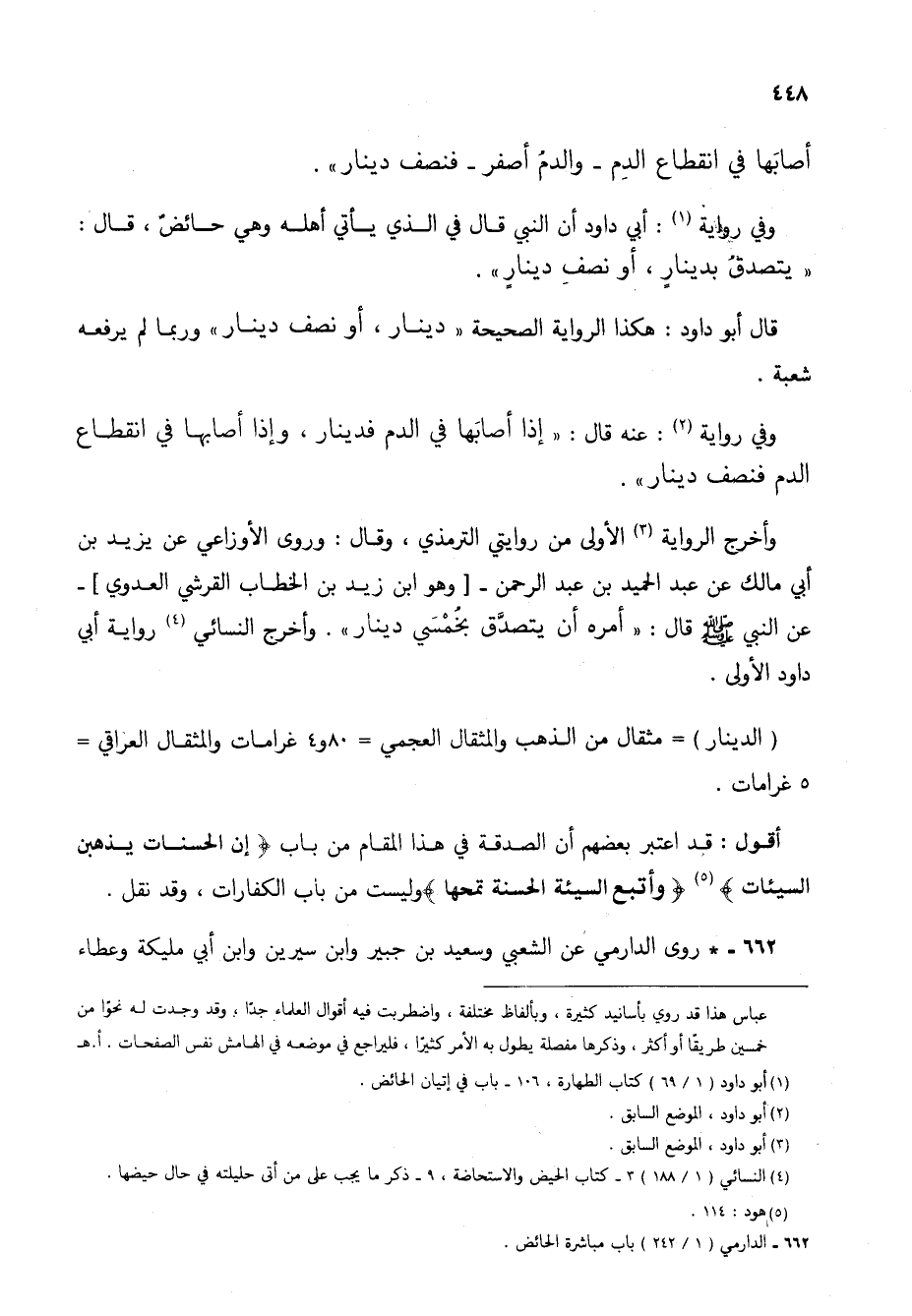 وفي رواية (1): أبي داود أن النبي قال في الذي يأتي أهله وهي حائض، قال "يتصدق بدينارٍ، أو نصف دينارٍ".