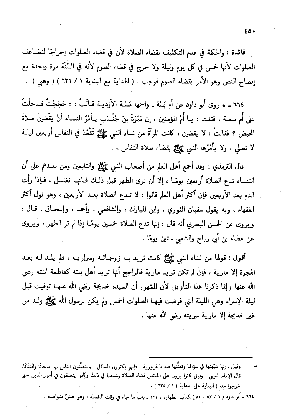 664 - * روى أبو داود ع أم بُسة - واسمها مُسَّة الأدية قالت: "حججتُ فدخلت على أم سلمة، فقلت: يا أم المؤمنين، إن سمُرة بن جُندب يأمر النساء أن يقضين صلاة المحيض؟ فقالت: لا يقضين، كانت المرأة من نساء النبي صلى الله عليه وسلم تقعدُ في النفاس أربعين ليلة لا تصلي، ولا يأمرها النبي صلى الله عليه وسلم بقضاء صلاة لانفاس".