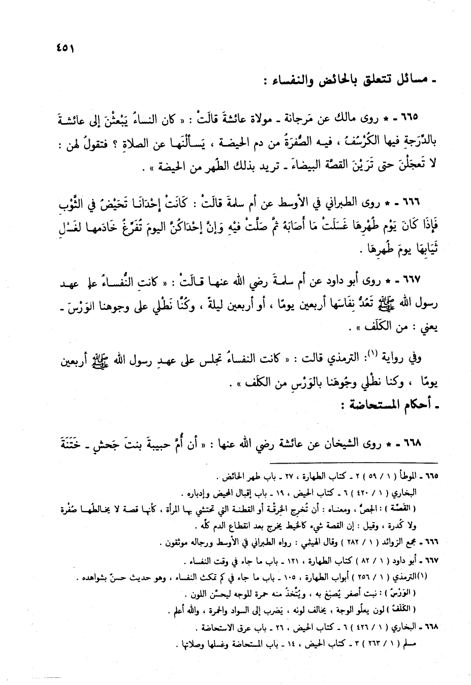 667 - * روى أبو داود عن أم سلمة رضي الله عنها قالت: "كانت النفساء على عهد رسول الله صلى الله عليه وسلم تعُدُّ نفاسها أربعين يوما، أو أربعين ليلةً، وكنا نطْلي على وجوهنا الورس- يعني: من الكلف".