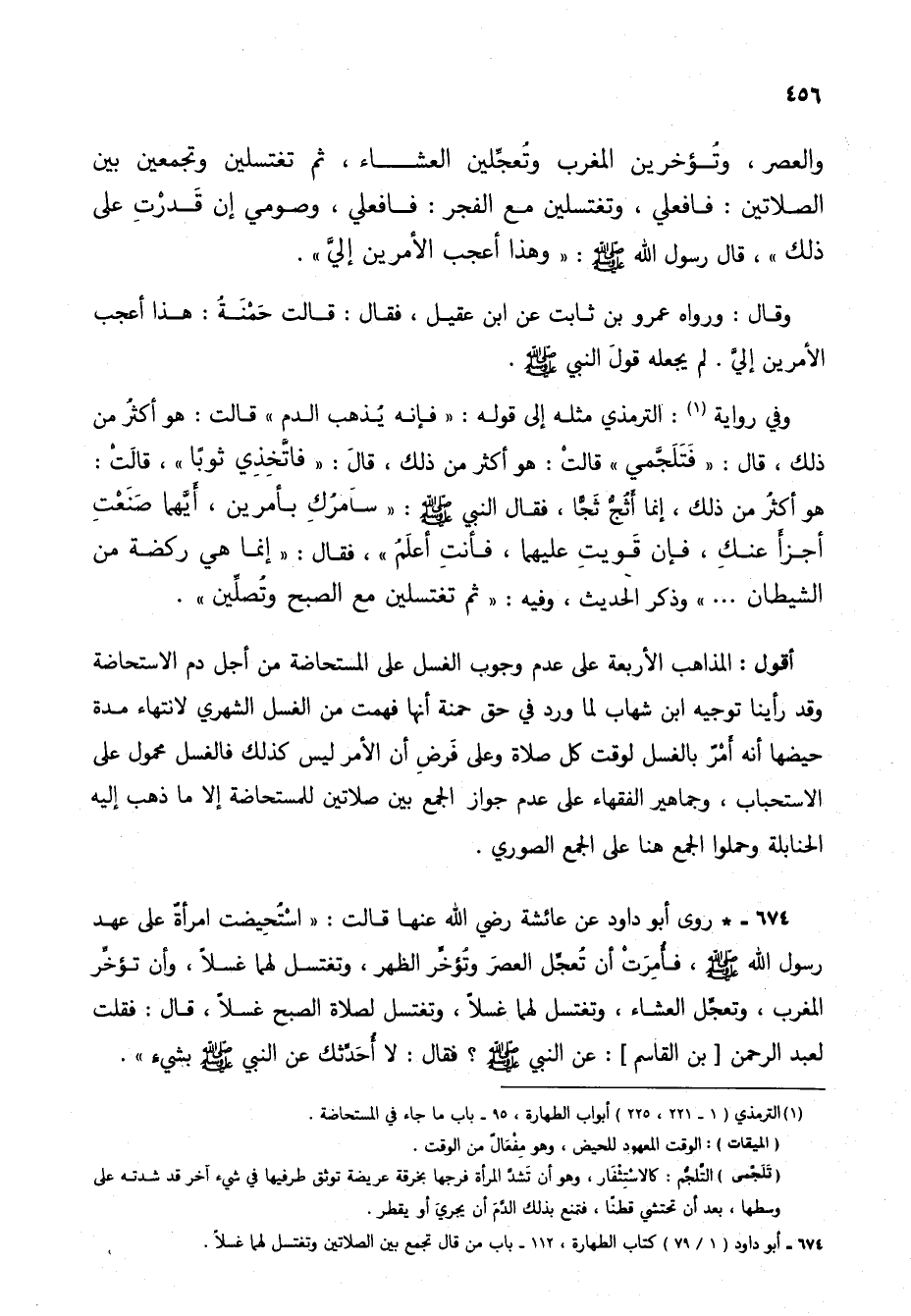 674 - * روى أبو داود عن عائشة رضي الله عنها قالت: "استَحيضت امرأة على عهد رسول الله صلى الله عليه وسلم، فأُمرتْ أن تُعجل العصر وتؤخر الظهر، وتغتسل لهما غسلاً، وأن تؤخر المغرب، وتعجل العشاء، وتغتسل لهما غسلاً، وتغتسل لصلاة الصبح غسلاً، قال: فقلت لعبد الرحمن [بن القاسم]: عن النبي صلى الله عليه وسلم؟ فقال: لا أُحدِّثك عن النبي صلى الله عليه وسلم بشيء".