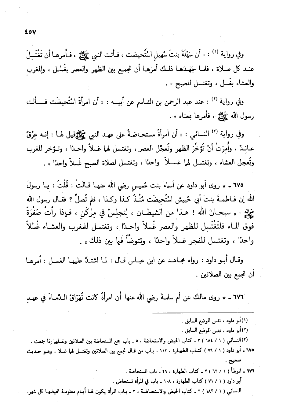 675 - * روى أبو داود عن أسماء بنت عُميسٍ رضي الله عنها قالت: قلت: يا رسول الله إن فاطمنة بنت أبي حُبيش استحيضت منذ كذا وكذا، فلم تصلِّ؟ فقال رسول الله صلى الله عليه وسلم: "سبحان الله! هذا من الشيطان، لتجلسْ في مركنٍ، فإذا رأت صُفرة فوق الماء فلتغتسل للظهر والعصر غُسلاً واحداً، وتغتسل للمغرب والعشاء غُسلاً واحداً، وتغتسل للفجر غسلاً واحداً، وتتوضأ فيما بين ذلك".
