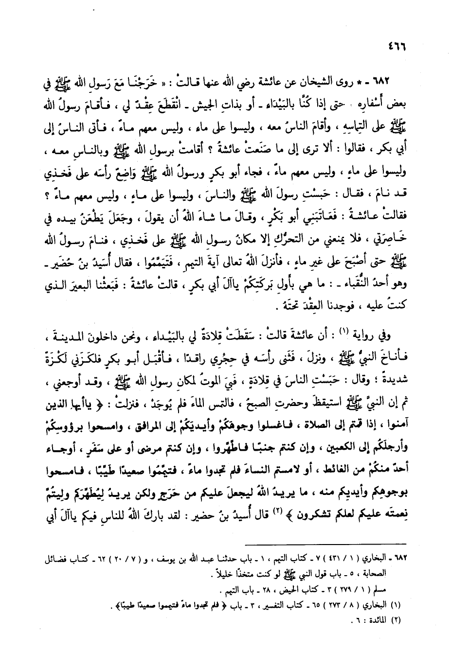 (1) البخاري (8/ 273) 65 - كتاب التفسير، 3 - باب (فلم تجدواماءً فتيمموا صعيداً طيباً.
