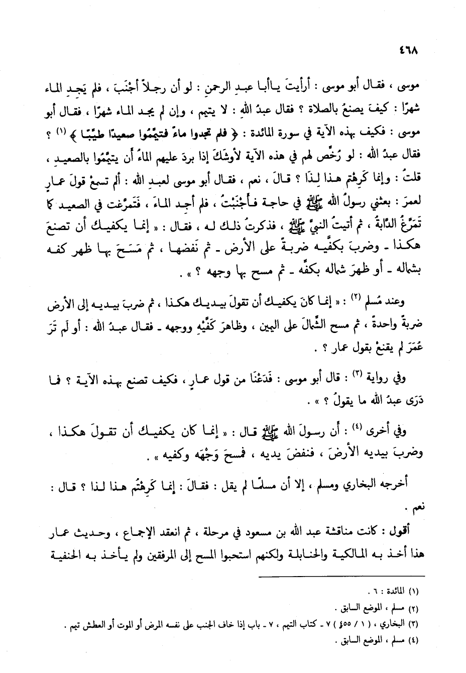 أقول: كانت مناقشة عبد الله بن مسعود في مرحلة، ثم انعقد الإجماع، وحديث عمار هذا أخذ به المالكية والحنابلة ولكنهم استحبوا المسح إلى المرفقين ولم يأخذ به الحنفية