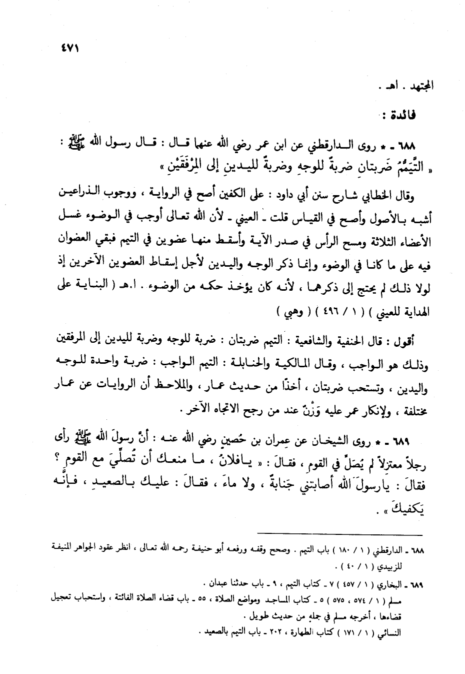 688 - * روى الدارقطني عن ابن عمر رضي الله عنهما قال: قال رسول الله صلى الله ليه وسلم: "التيمم ضربتان ضربةٌ للوجه وضربةٌ لليدين إلى المرفقين".