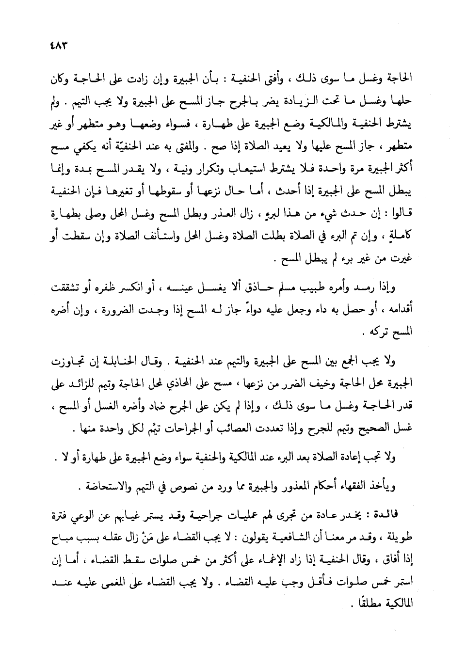 الحاجة وغسل ما سوى ذلك، وأفتى الحنفية: بأن الجبيرة وإن زادت على الحاجة وكان حلها وغسل ما تحت الزيادة يضر بالجرح جاز المسح على الجبيرة ولا يجب التيمم. ولم يشترط الحنفية والمالكية وضع الجبيرة على طهارة، فسواء وضعها وهو متطهر أو غير متطهر، جاز المسح عليها ولا يعيد الصلاة إذا صح. والمفتي به عند الحنفية أن يكفي مسح أكثر الجبيرة مرة واحدة فلا يشترط استيعاب وتكرار ونية، ولا يقدر المسح بمدة وإنما يبطل المسح على الجبيرة إذا أحدث، أما حال نزعها او سقوطها أو تغيرها فإن الحنفية قالوا: إن حدث شيء من هذا لبرءٍ، زال العذر وبطل المسح وغسل المحل وصلى بطهارة كاملة، وإن تم البرء في الصلاة بطلت الصلاة وغسل المحل واستأنف الصلاة ون سقطت أو غيرت من غير برء لم يبطل المسح.