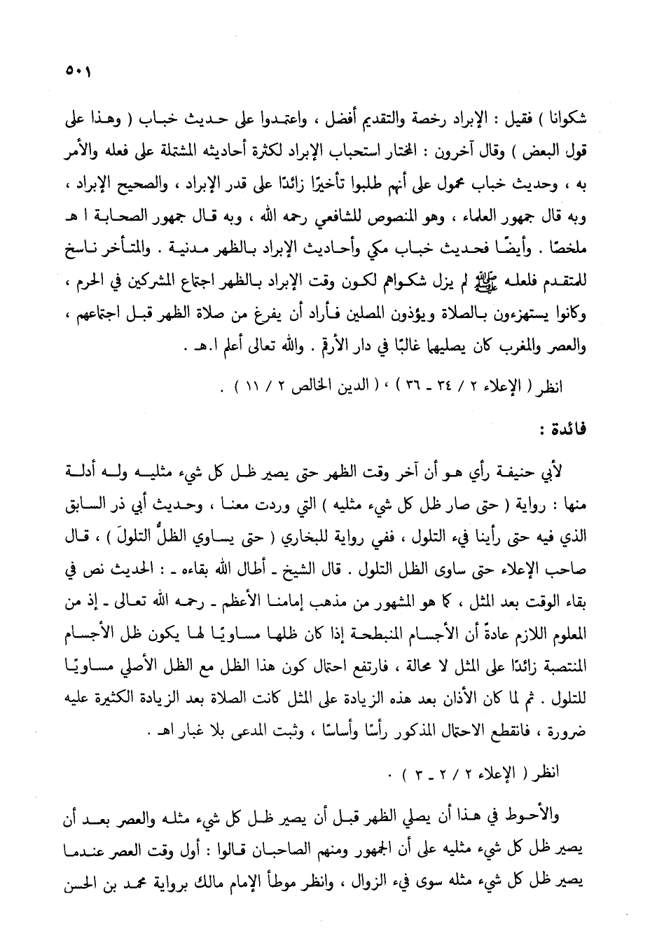 والأحوط في هذا أن يصلي الظهر قبل أن يصير ظل كل شيء مثله والعصر بعد أن يصير ظل كل شيء مثليه على أن الجمهور ومنهم الصاحبان قالوا: أول وقت العصر عندما يصير ظل كل شيء مثله سوى فيء الزوال، وانظر موطأ الإمام مالك برواية محمد بن الحسن