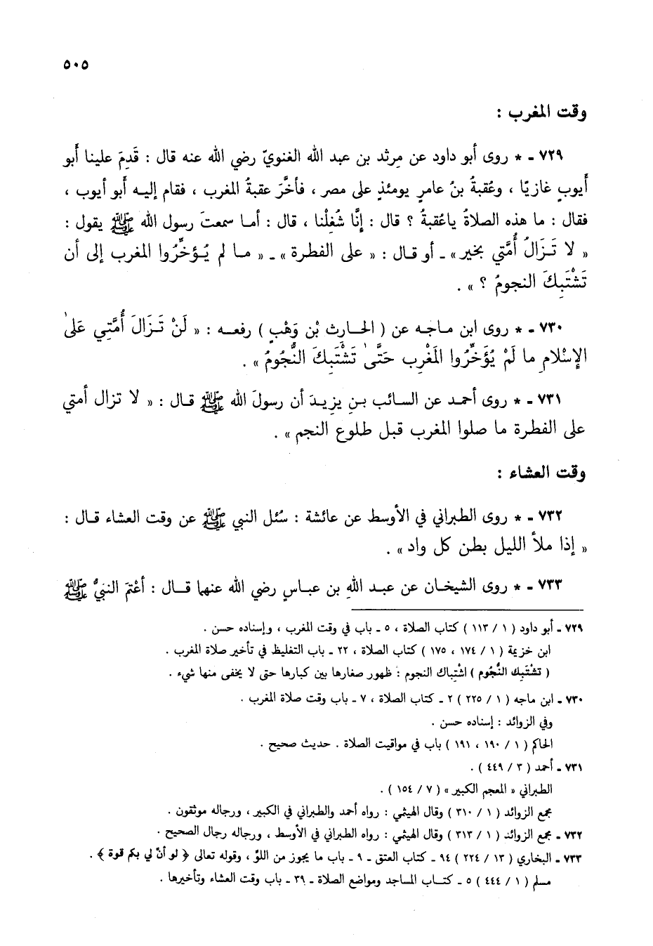 730 - * روى ابن ماجه عن (الحارث بن وهبٍ) رفعه: "لن تزال أمتي على الإسلام ما لم يؤخروا المغرب حتى تشتبك النجوم".