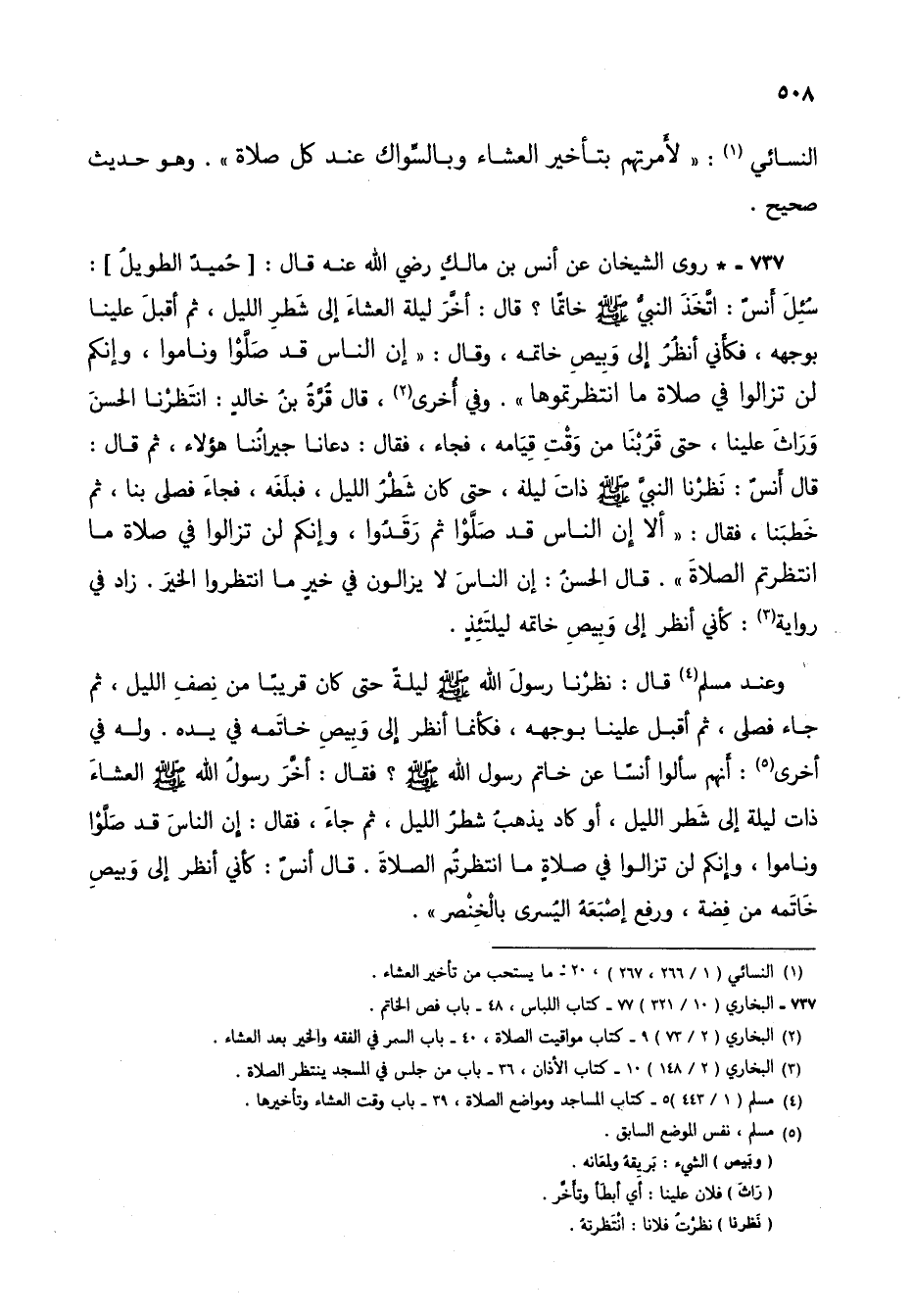 737 - * روى الشيخان عن أنس بن مالك رضي الله عنه قال: [حُميدٌ الطويلُ]: سُئل أنسٌ: اتخذ النبي صلى الله عليه وسلم خاتماً؟ قال: أخرَ ليلة العشاء إلى شطر الليل، ثم أقبل علينا بوجهه، فكأني أنظرُ إلى وبيص خاتمه، وقال: "إن الناس قد صلوا وناموا، وإنكم لن تزالوا في صلاة ما انتظرتموها". وفي أخرى (2)، قال قُرةُ بن خالد: انتظرنا الحسن وراثَ علينا، حتى قرُبْنا من وقت قيامه، فجاء، فقال: دعانا جيراننا هؤلاء، ثم قال: قال أنس: نظرنا النبي صلى الله عليه وسلم ذات ليلة، حتى كان شطرُ الليل، فبلغه، فجاء فصلى بنا، ثم خطبنا، فقال: "ألا إن الناس قد صلوا ثم رقدُوا، وإنكم لن تزالوا في صلاة ما انتظرتم الصلاة". قال الحسنُ: إن الناسَ لا يزالون في خيرٍ ما انتظروا الخير، زاد في رواية (3): كأني أنظر إلى وبيص خاتمه ليلتئذٍ.