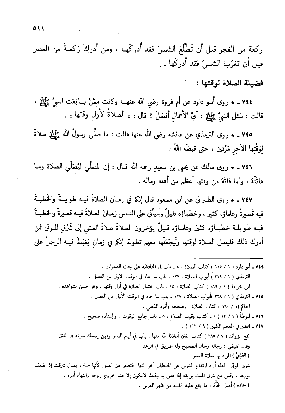 745 - * روى الترمذي عن عائشة رضي الله عنها قالت: ما صلى رسول الله صلى الله عليه وسلم صلاة لوقتها الآخِر مرتين، حتى قبضه الله.