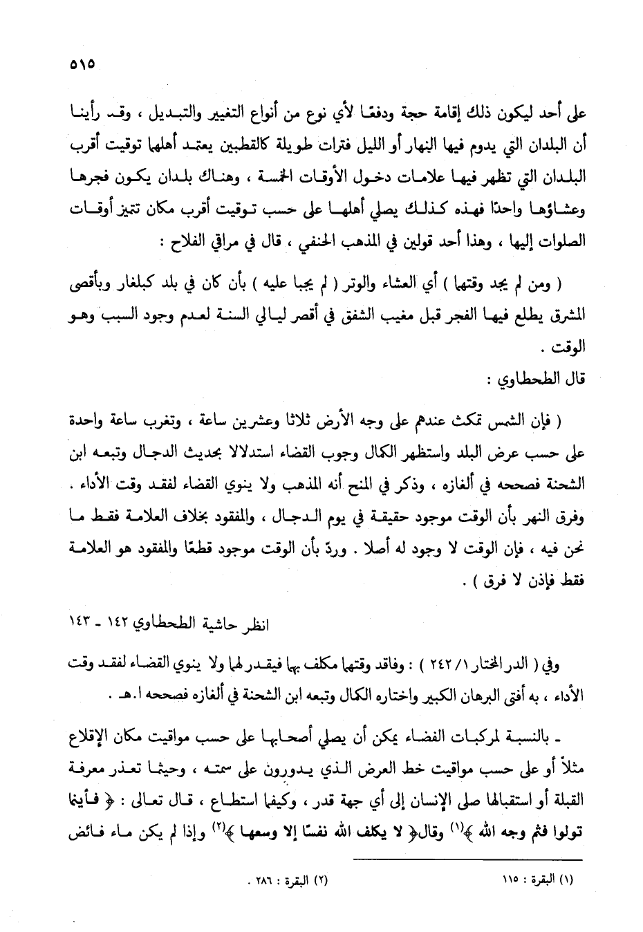 على أحد ليكون ذلك إقامة حجة ودفعاً لأي نوع من أنواع التغيير والتبديل وقد رأينا أن البلدان التي يدوم فيا النهار أو الليل فترات طويلة كالقطبين يعتمد أهلهما توقيت أقرب البلدان التي تظهر فيها علامات دخول الأوقات الخمسة، وهناك بلدان يكون فجرها وعشاؤها واحداً فهذه كذلك يصلي أهلها على حسب توقيت أقرب مكان تتميز أوقات الصلوات إليها، وهذا أحد قولين في المذهب الحنفي، قال في مراقي الفلاح:
