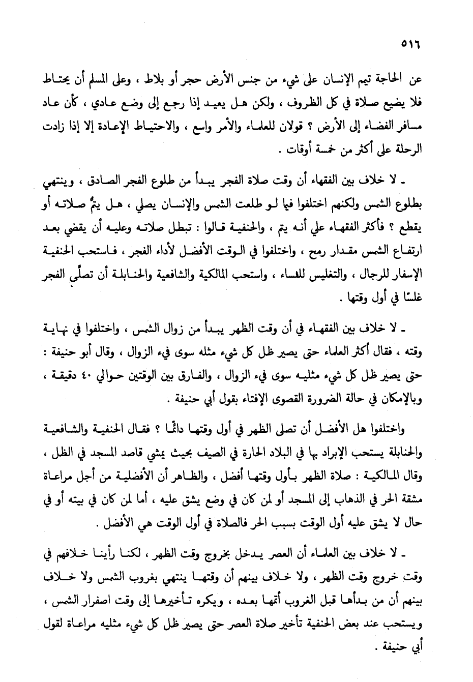 - لا خلاف بين الفقهاء أن وقت صلاة الفجر يبدأ من طلوع الفجر الصادق، وينتهي بطلوع الشمس ولكنهم اختلفوا فيما لو طلعت الشمس والإنسان يصلي، هل يتمُّ صلاته أو يقطع؟ فأكثر الفقهاء على أنه يتم، والحنفية قالوا: تبطل صلاته وعليه أن يقضي بعد ارتفاع الشمس مقدار رمح، واختلفوا في الوقت الأفضل لأداء الفجر، فاستحب الحنفية الإسفار للرجال، والتغليس للنساء، واستحب المالكية والشافعية والحنابلة أن تصلي الفجر غلساً في أول وقتها.