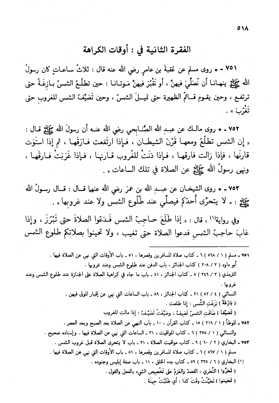 751 - * روى مسلم عن عقبة بن عامر رضي الله عنه قال: ثلاثُ ساعاتٍ كان رسول الله صلى الله عليه وسلم ينهانا أن نُصلي فيهن، أو نقبُر فيهن موتانا: حين تطلعُ الشمس بازغةً حتى ترتفع، وحين يقوم قائمُ الظهيرة حتى تميل الشمس، وحين تضيف الشمس للغروب حتى تغرُب".