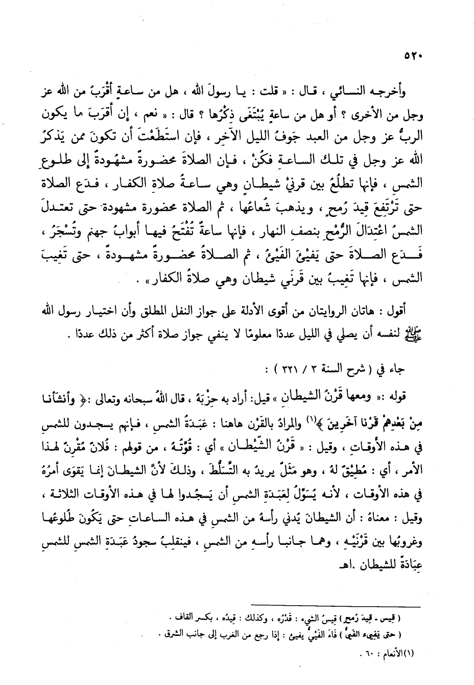 وأخرجه النسائي، قال: "قلت: يا رسول الله، هل من ساعةٍ أقرب من الله عز وجل من الأخرى؟ أو هل من ساعة يُبتغى ذكرُها؟ قال: "نعم، إن أقرب ما يكون الربُّ عز وجل من العبد جوفُ الليل الآخر، فإن استطعت أن تكون ممن يذكر الله عز وجل في تلك الساعة فكُنْ، فإن الصلاة محضورةٌ مشهودةٌ إلى طلوع الشمس، فإنها تطلعُ بين قرنيْ شيطان وهي ساعةُ صلاة الكفار، فدع الصلاة حتى ترتفع قيد رُمحٍ، ويذهب شُعاعها، ثم الصلاة محضورة مشهودة حتى تعتدل فدع الصلاة حتى يفيء الفيءُ، ثم الصلاة محضورةٌ مشهودةٌ، حتى تغيب الشمس، فإنها تغيبُ بين قرني شيطان وهي صلاة الكفار".
