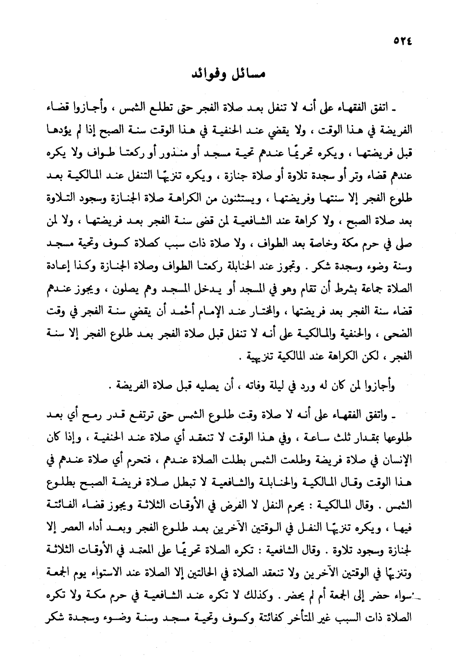 - واتفق الفقهاء على أنه لا صلاة وقت طلوع الشمس حتى ترتفع قدر رمح أي بعد طلوعها بمقدار ثلث ساعة، وفي هذا الوقت لا تنعقد أي صلاة عند الحنفية، وإذا كان الإنسان في صلاة فريضة وطلعت الشمس بطلت الصلاة عندهم، فتحرم أي صلاة عندهم في هذا الوقت وقال المالكية والحنابلة والشافعية لا تبطل صلاة فريضة الصبح بطلوع الشمس. وقال المالكية: يحرم النفل لا الفرض في الأوقات الثلاثةويجوز قضاء الفائتة فيها، ويكره تنزيهاً النفل في الوقتين الآخرين بعد طلوع الفجر وبعد أداء العصر إلا لجنازة وسجود تلاوة. وقال الشافعية: تركه الصلاة تحريماً على المعتمد في الأوقات الثلاثة وتنزيهاً في الوقتين الآخرين ولا تنعقد الصلاة في الحالتين إلا الصلاة عند الاستواء يوم الجمعة سواء حضر إلى الجمعة أم لم يحضر. وكذلك لا تكره عند الشافعية في حرم مكة ولا تكره الصلاة ذات السبب غير المتأخر كفائتة وكسوف وتحية مسجد وسنة وضوء وسجدة شكر