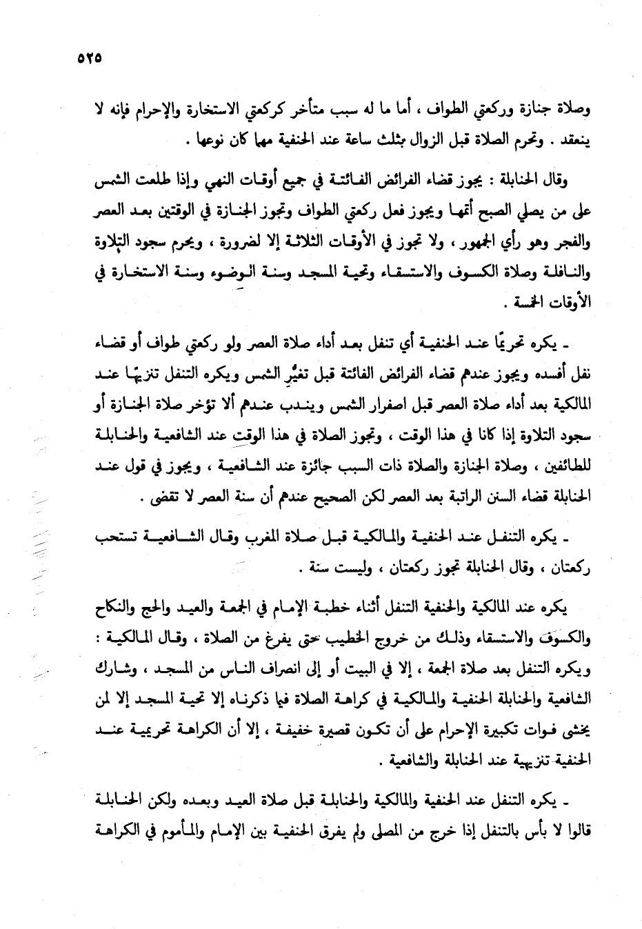 - يكره تحريماً عند الحنفية أي تنفل بعد أداء صلاة العصر ولو ركعتي طواف أو قضاء نفل أفسده ويجوز عندهم قضاء الفرائض الفائتة قبل تغيُّرِ الشمس ويكره التنفل تنزيهاً عند المالكية بعد أداء صلاة العصر قبل اصفرار الشمس ويندب عندهم ألا تؤخر صلاة الجنازة أو سجود التلاوة إذا كانا في هذا الوقت، وتجوز الصلاة في هذا الوقت عند الشافعية والحنابلة للطائفين، وصلاة الجنازة والصلاة ذات السبب جائزة عند الشافعية، ويجوز في قول عند الحنابلة قضاء السنن الراتبة بعد العصر لكن الصحيح عندهم أن سنة العصر لا تقضي.