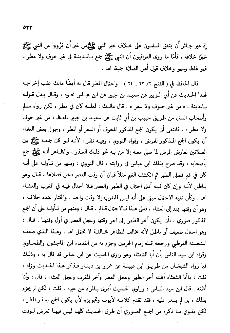 قال الحافظ في (الفتح 2/ 23 - 24): واحتمال المطر قال به أيضاً مالك عقب إخراجه لهذا الحديث عن أبي الزبير عن سعيد بن جبير عن ابن عباس نحوه، وقال بدل قوله بالمدينة: "من غير خوف ولا سفر". قال مالك: لعله كان في مطر، لكن رواه مسلم وأصحاب السنن من طريق حبيب بن أبي ثابت عن سعيد بن جبير بلفظ: من غير خوف ولا مطر". فانتفى أن يكون الجمع المذكور للخوف أو السفر أو المطر، وجوز بعض العلماء أن يكون الجمع المذكور للمرض، وقواه النووي، وفيه نظر، لأنه لو كان جمعه صلى الله عليه وسلم بين الصلاتين لعاض المرض لما صلى معه إلا من به نحو ذلك العذر، والظاهر أنه صلى الله عليه وسلم جمع بأصحابه، وقد صرح بذلك ابن عباس في روايته، قال النووي: ومنهم من تأوله على أنه كان في غيم فصلى الظهر ثم انكشف الغيم مثلاً فبان أن وقت العصر دخل فصلاها، قال وهو باطل لأنه وإن كان فيه أدنى احتمال في الظهر والعصر فلا احتمال فيه في المغرب والعشاء اهـ. وكأن نفيه الاحتمال مبني على أنه ليس للمغرب إلا وقت واحد، والمختار عنده خلافه، وهو أن وقتها يمتد إلى العشاء، فعلى هذا فالاحتمال قائم. قال: ومنهم من تأوله على أن الجمع المذكور صوري، بأن يكون أخر الظهر إلى آخر وقتها وعجل العصر في أول وقتها. قال: وهو احتمال ضعيف أو باطل لأنه مخالف للظاهر مخالفة لا تحتمل اهـ. وهذا الذي ضعفه استحسنه القرطبي ورجحه قبله إمام الحرمين وجزم به من القدماء ابن الماجشون والطحاوي وقواه ابن سيدالنسا بأن أبا الشعثاء وهو راوي الحديث عن ابن عباس قد قال به، وذلك فيما رواه الشيخان من طريق ابن عيينة عن عمرو بن دينار فذكر هذا الحديث وزاد: قلت: يا أبا الشعثاء أظنه أخر الظهر وعجل العصر وأخر المغرب وعجل العشاء، قال: وأنا أظنه. قال ابن سيد الناس: وراوي الحديث أدري بالمراد من غيره. قلت: لكن لم يجزم بذلك، بل لم يستمر عليه، فقد تقدم كلامه لأيوب وتجويزه لأن يكون الجمع بعذر املطر، لكن يقوي ما ذكره من الجمع الصوري أن طرق الحديث كلها ليس فيها تعرض لوقت