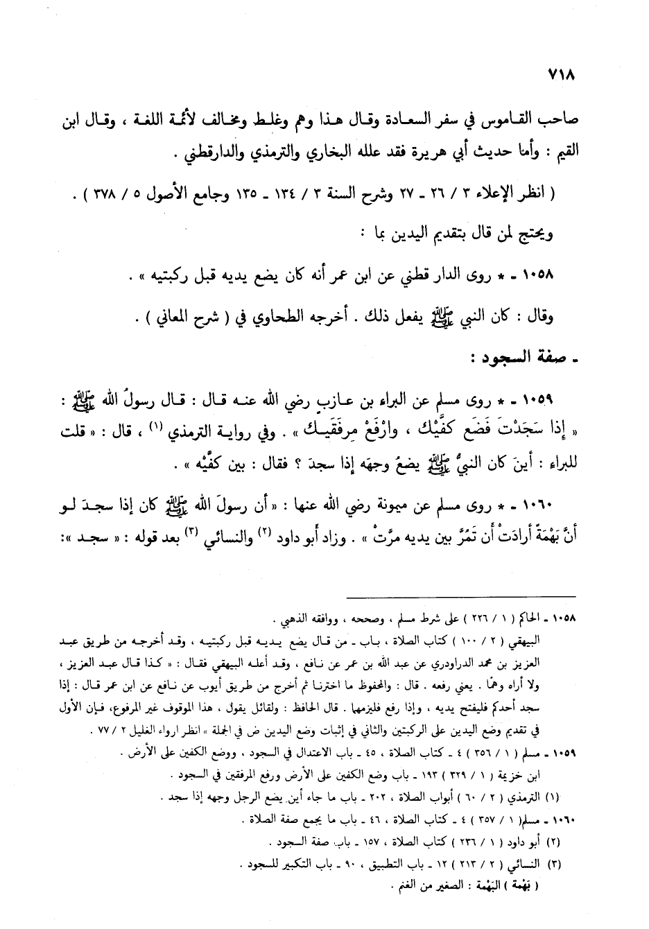 1060 - * روى مسلم عن ميمونة رضي الله عنها: "أن رسول الله صلى الله عليه وسلم كان إذا سجد لو أن بهمة أرادت أن تمر بين يديه مرت". وزاد أبو داود (5) والنسائي (6) بعد قوله: "سجد":