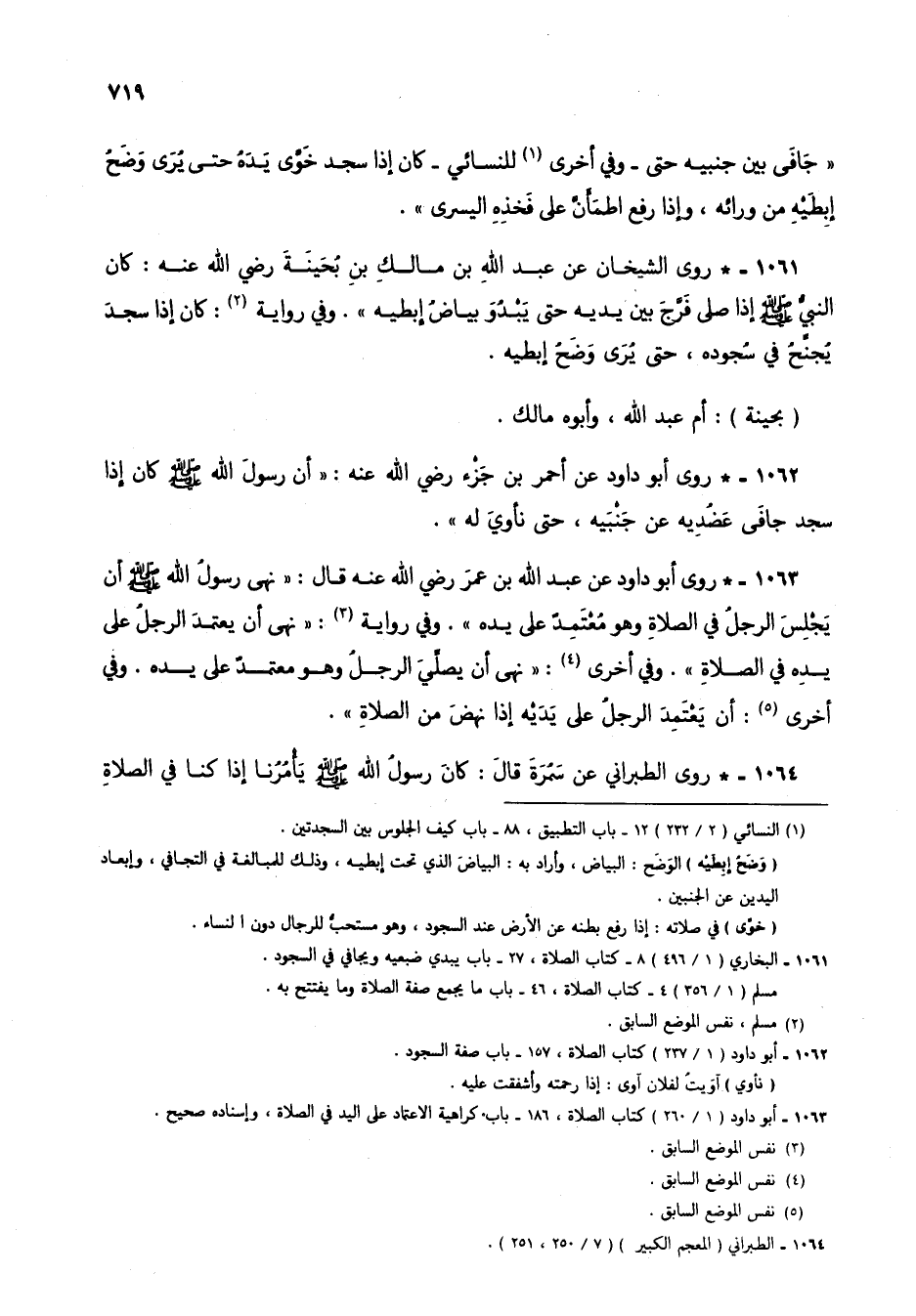 1061 - * روى الشيخان عن عبد الله بن مالك بن بحينة رضي الله عنه: كان النبي صلى الله عليه وسلم إذا صلى فرج بين يديه حتى يبدو بياض إبطيه". وفي رواية (2): كان إذا سجد يجنح في سجوده، حتى يرى وضح إبطيه.