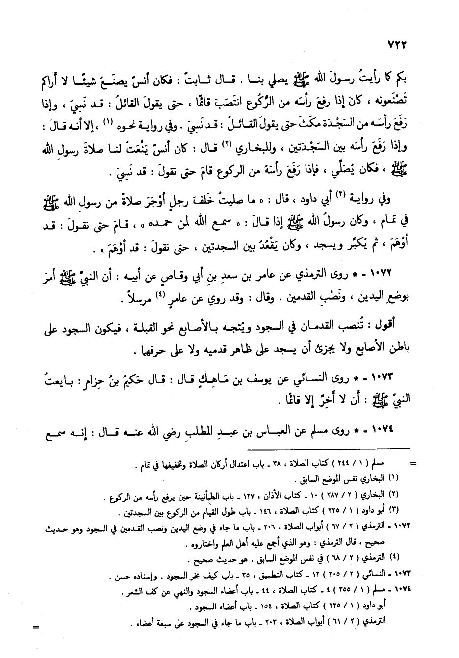 1072 - * روى الترمذي عن عامر بن سعد بن أبي وقاص عن أبيه: أن النبي صلى الله عليه وسلم أمر بوضع اليدين، ونصب القدمين. وقال: وقد روي عن عامر (4) مرسلاً.