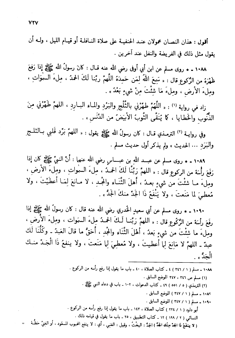 1089 - * روى مسلم عن عبد الله بن عباس رضي الله عنهما: أن النبي صلى الله عليه وسلم كان إذا رفع رأسه من الركوع قال: "اللهم ربنا لك الحمد، ملء السموات، وملء الأرض، وملء ما شئت من شيء بعد، أهل الثناء والمجد، لا مانع لما أعطيت، ولا معطي لما منعت، ولا ينفع ذا الجد منك الجد".