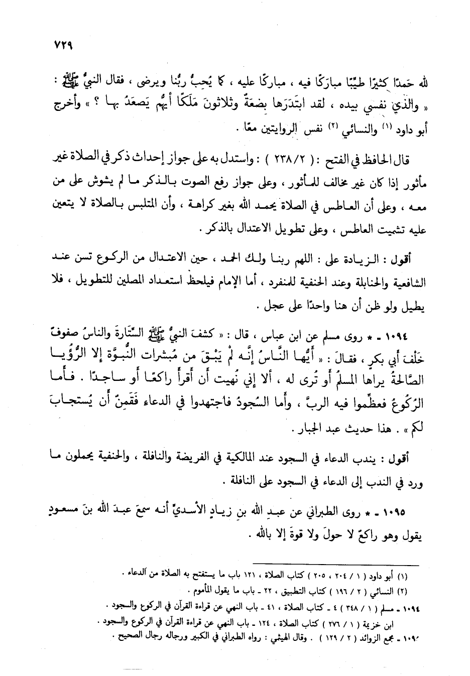 1094 - * روى مسلم عن ابن عباس، قال: "كشف النبي صلى الله عليه وسلم الستارة والناس صفوف خلف أبي بكر، فقال: "أيها الناس إنه لم يبق من مبشرات النبوة إلا الرؤيا الصالحة يراها المسلم أو ترى له، ألا إني نهيت أن أقرأ راكعاً أو ساجداً. فأما الركوع فعظموا فيه الرب، وأما السجود فاجتهدوا في الدعاء فقمن أن يستجاب لكم". هذا حديث عبد الجبار.