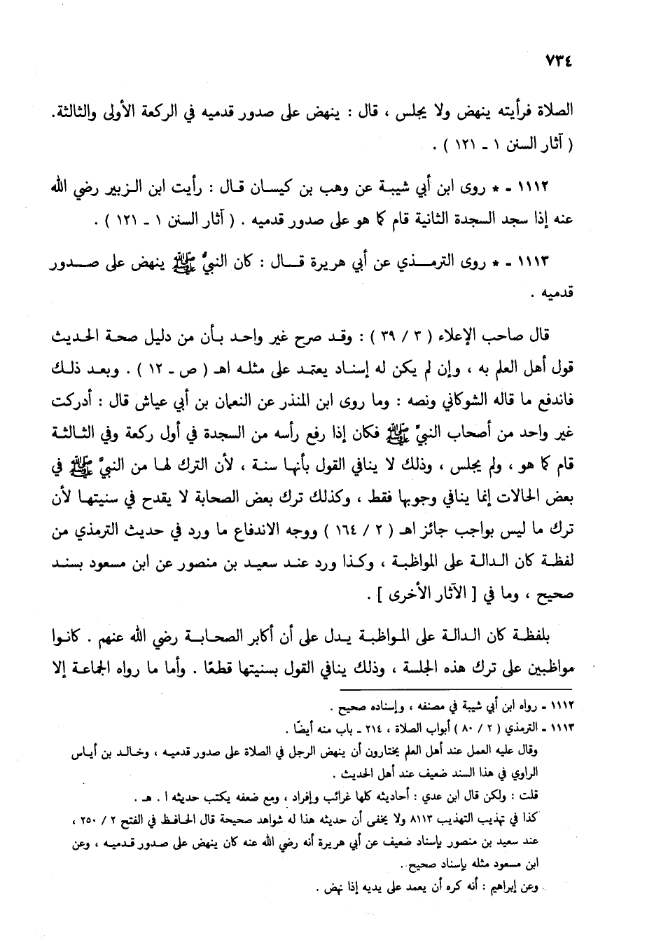 1112 - * روى ابن أبي شيبة عن وهب بن كيسان قال: رأيت ابن الزبير رضي الله عنه إذا سجد السجدة الثانية قام كما هو على صدور قدميه. (آثار السنن 1 - 121).