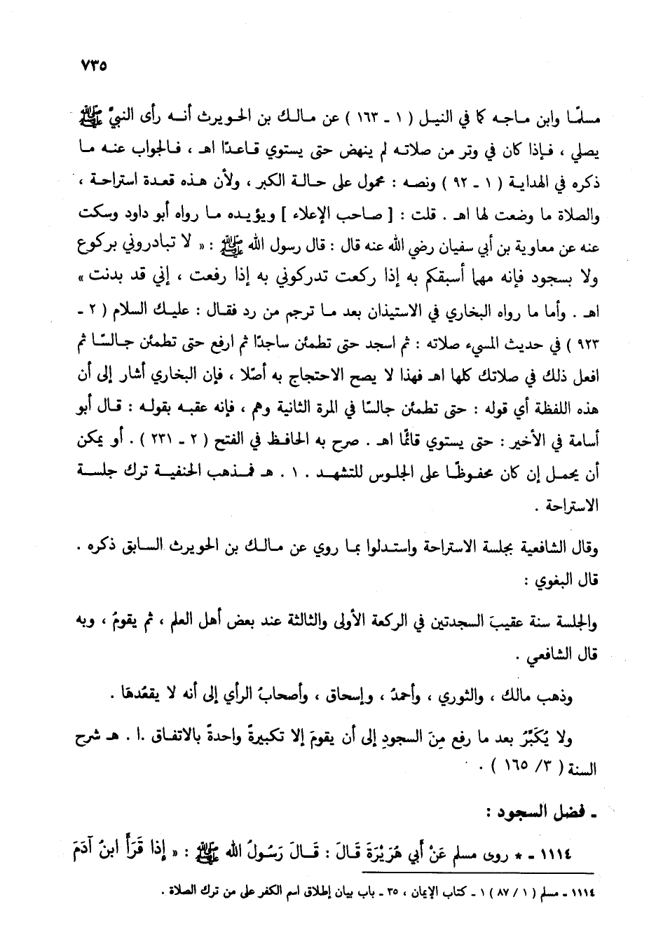 مسلماً وابن ماجه كما في النيل (1 - 163) عن مالك بن الحويرث أنه رأى النبي صلى الله عليه وسلم يصلي، فإذا كان في وتر من صلاته لم ينهض حتى يستوي قاعداً اهـ، فالجواب عنه ما ذكره في الهداية (1 - 92) ونصه: محمول على حالة الكبر، ولأن هذه قعدة استراحة، والصلاة ما وضعت لها اهـ. قلت: [صاحب الإعلاء] ويؤيده ما رواه أبو داود وسكت عنه عن معاوية بن أبي سفيان رضي الله عنه قال: قال رسول الله صلى الله عليه وسلم: "لا تبادروني بركوع ولا بسجود فإنه مهما أسبقكم به إذا ركعت تدركوني به إذا رفعت، إني قد بدنت" اهـ. وأما ما رواه البخاري في الاستيذان بعد ما ترجم من رد فقال: عليك السلام (2 - 923) في حديث المسيء صلاته: ثم اسجد حتى تطمئن ساجداً ثم ارفع حتى تطمئن جالساً ثم افعل ذلك في صلاتك كلها اهـ فهذا لا يصح الاحتجاج به أصلاً، فإن البخاري أشار إلى أن هذه اللفظة أي قوله: حتى تطمئن جالساً في المرة الثانية وهم، فإنه عقبه بقوله: قال أبو أسامة في الأخير: حتى يستوي قائماً اهـ. صرح به الحافظ في الفتح (2 - 231). أو يمكن أن يحمل إن كان محفوظاً على الجلوس للتشهد. ا. هـ فمذهب الحنفية ترك جلسة الاستراحة.