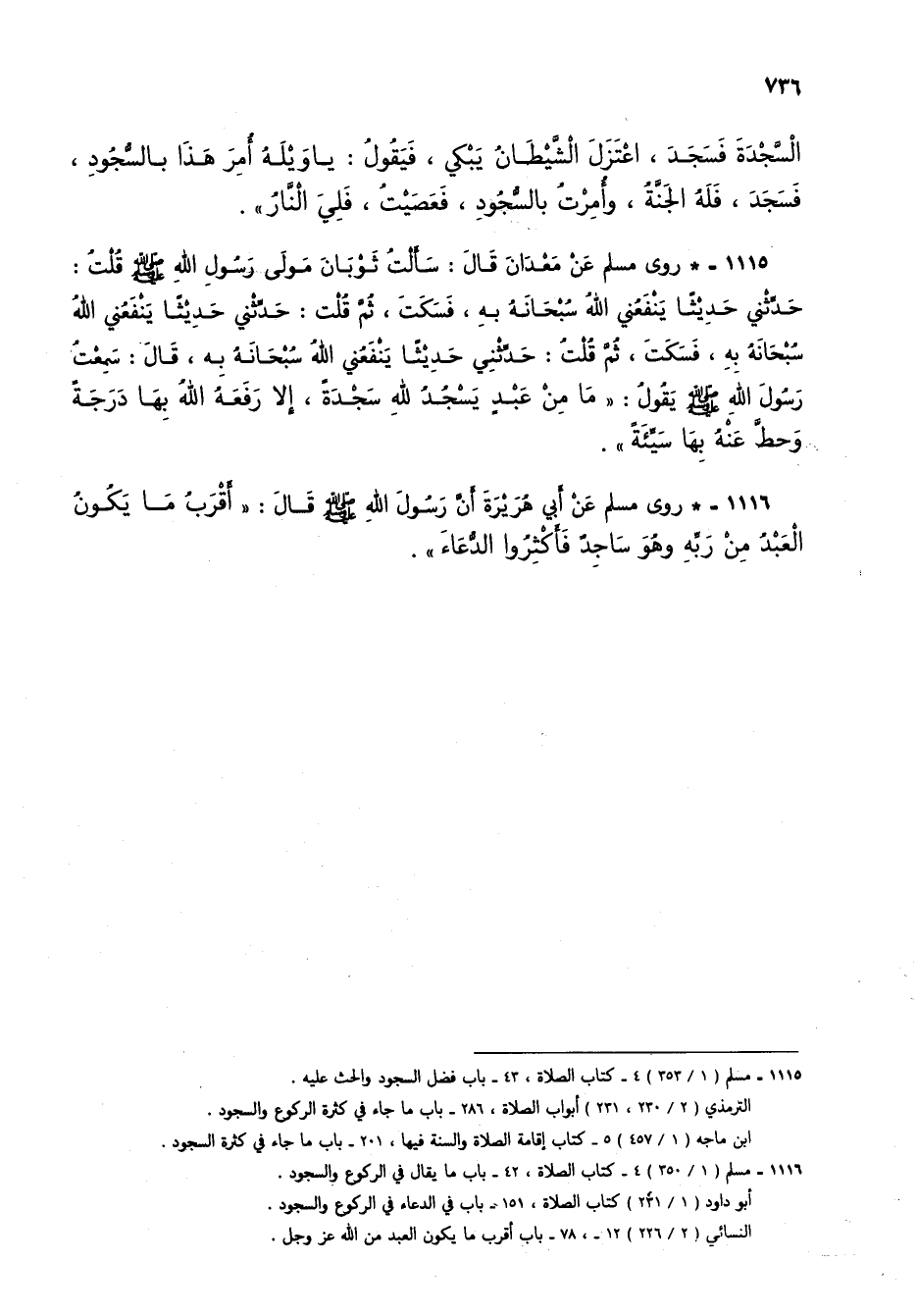 1116 - * روى مسلم عن أبي هريرة أن رسول الله صلى الله عليه وسلم قال: "أقرب ما يكون العبد من ربه وهو ساجد فأكثروا الدعاء".