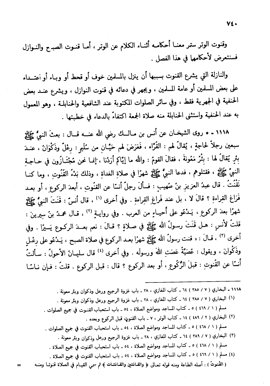 1118 - * روى الشيخان عن أنس بن مالك رضي الله عنه قال: بعث النبي صلى الله عليه وسلم سبعين رجلاً لحاجة، يقال لهم: القراء، فعرض لهم حيان من سليم: رعل وذكوان، عند بئر يقال لها: بئر معونة، فقال القوم: والله ما إياكم أردنا، إنما نحن مجتازون في حاجة النبي صلى الله عليه وسلم، فقتلوهم، فدعا النبي صلى الله عليه وسلم شهراً في صلاة الغداة، وذلك بدء القنوت، وما كنا نقنت. قال عبد العزيز بن صهيب: فسأل رجل أنساً عن القنوت، أبعد الركوع، أو بعد فراغ القراءة؟ قال لا، بل عند فراغ القراءة. وفي أخرى (2)، قال أنس: قنت النبي صلى الله عليه وسلم شهراً بعد الركوع، يدعو على أحياء من العرب. وفي رواية (3)، قال محمد بن سيرين: قلت لأنس: هل قنت رسول الله صلى الله عليه وسلم في صلاة؟ قال: نعم بعد الركوع يسيراً. وفي أخرى (4)، قال: "قنت رسول الله صلى الله عليه وسلم شهراً بعد الركوع في صلاة الصبح، يدعو على رعل وذكوان، ويقول: عصية عصت الله ورسوله. وفي أخرى (5) قال سليمان الأحول: سألت أنساً عن القنوت: قبل الركوع، أو بعد الركوع؟ قال: قبل الركوع. قلت: فإن ناساً