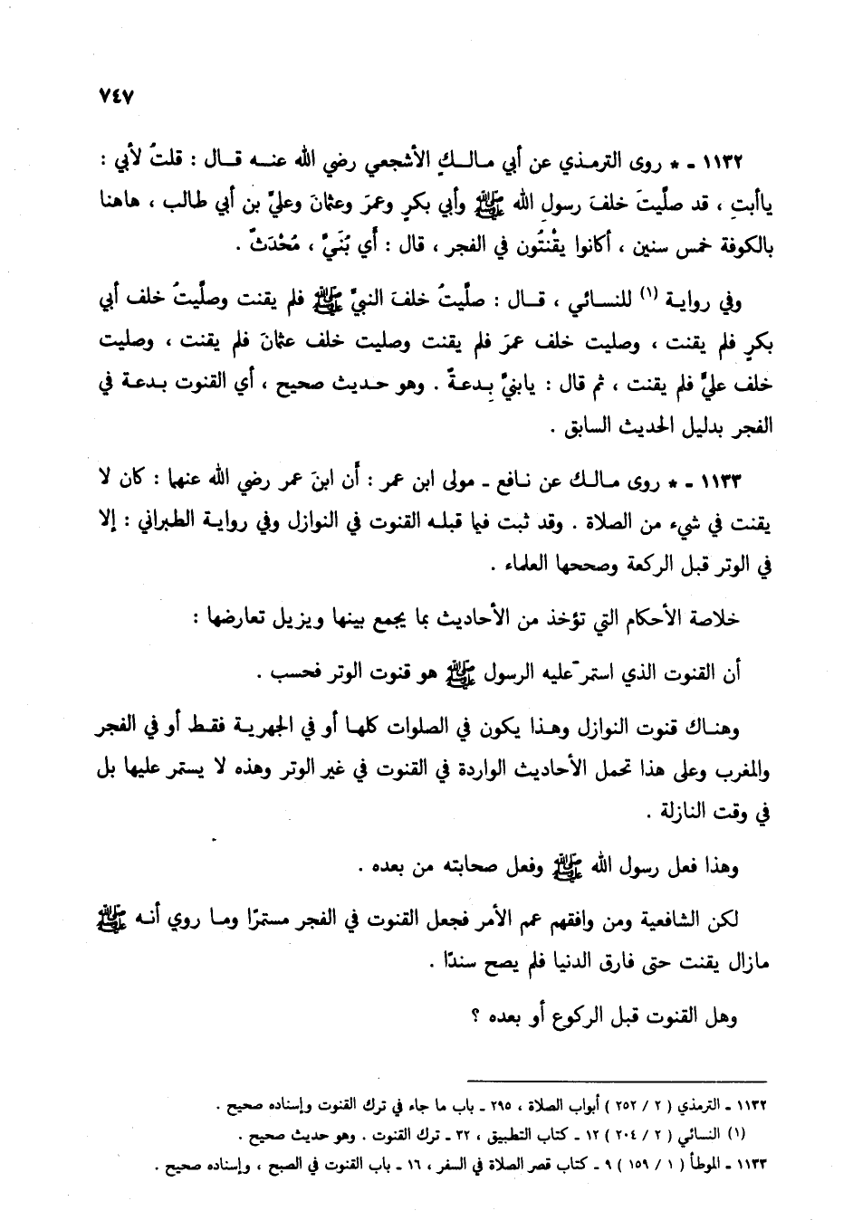 1133 - * روى مالك عن نافع- مولى ابن عمر: أن ابن عمر رضي الله عنهما: كان لا يقنت في شيء من الصلاة. وقد ثبت فيما قبله القنوت في النوازل وفي رواية الطبراني: إلا في الوتر قبل الركعة وصححها العلماء.