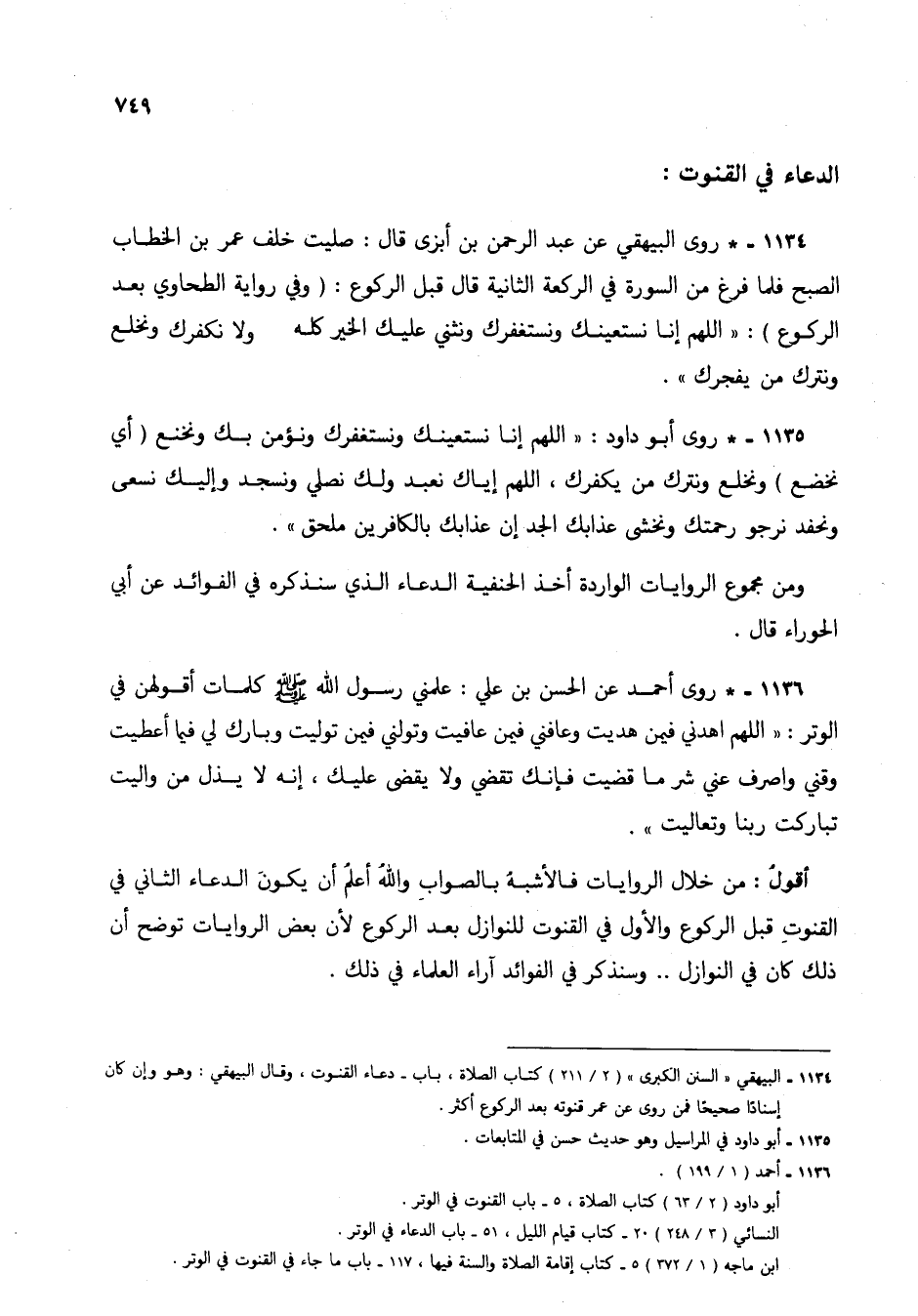 1134 - * روى البيهقي عن عبد الرحمن بن أبزى قال: صليت خلف عمر بن الخطاب الصبح فلما فرغ من السورة في الركعة الثانية قال قبل الركوع: (وفي رواية الطحاوي بعد الركوع): "اللهم إنا نستعينك ونستغفرك ونثني عليك الخير كله ولا نكفرك ونخلع ونترك من يفجرك".