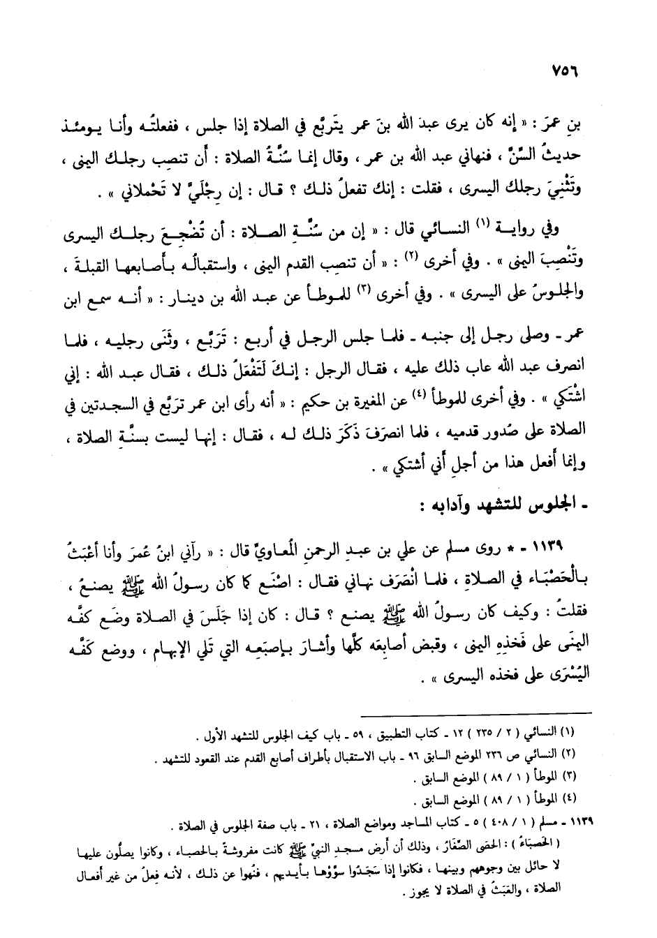 بن عمر: "إنه كان يرى عبد الله بن عمر يتربع في الصلاة إذا جلس، ففعلته وأنا يومئذ حديث السن، فنهاني عبد الله بن عمر، وقال إنما سُنَّةُ الصلاة: أن تنصب رجلك اليمنى، وتثني رجلك اليسرى، فقلت: إنك تفعل ذلك؟ قال: إن رجلي لا تحملاني".