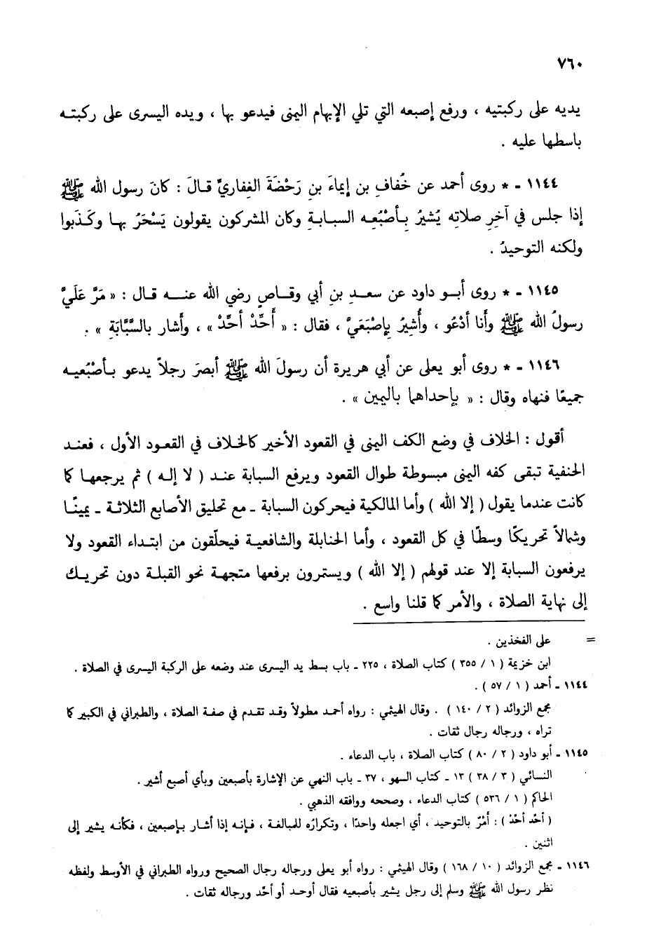 1144 - * روى أحمد عن خفاف بن إيماء بن رحضة الغفاري قال: كان رسول الله صلى الله عليه وسلم إذا جلس في آخر صلاته يشير بأصبعه السبابة وكان المشركون يقولون يسحر بها وكذبوا ولكنه التوحيد.