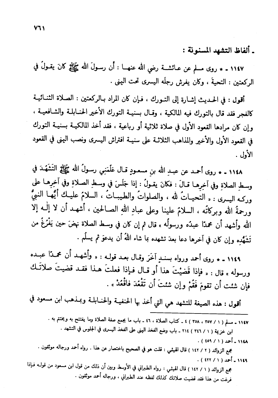 1148 - * روى أحمد عن عبد الله بن مسعود قال علمني رسول الله صلى الله عليه وسلم التشهد في وسط الصلاة وفي آخرها قال: فكان يقول: إذا جلس في وسط الصلاة وفي آخرها على وركه اليسرى: "التحيات لله، والصلوات والطيبات، السلام عليك أيها النبي ورحمة الله وبركاته، السلام علينا وعلى عباد الله الصالحين، أشهد أن لا إله إلا الله وأشهد أن محمداً عبده ورسوله" قال ثم إن كان في وسط الصلاة نهض حين يفرغ من تشهده وإن كان في آخرها دعا بعد تشهده بما شاء الله أن يدعو ثم يسلم.