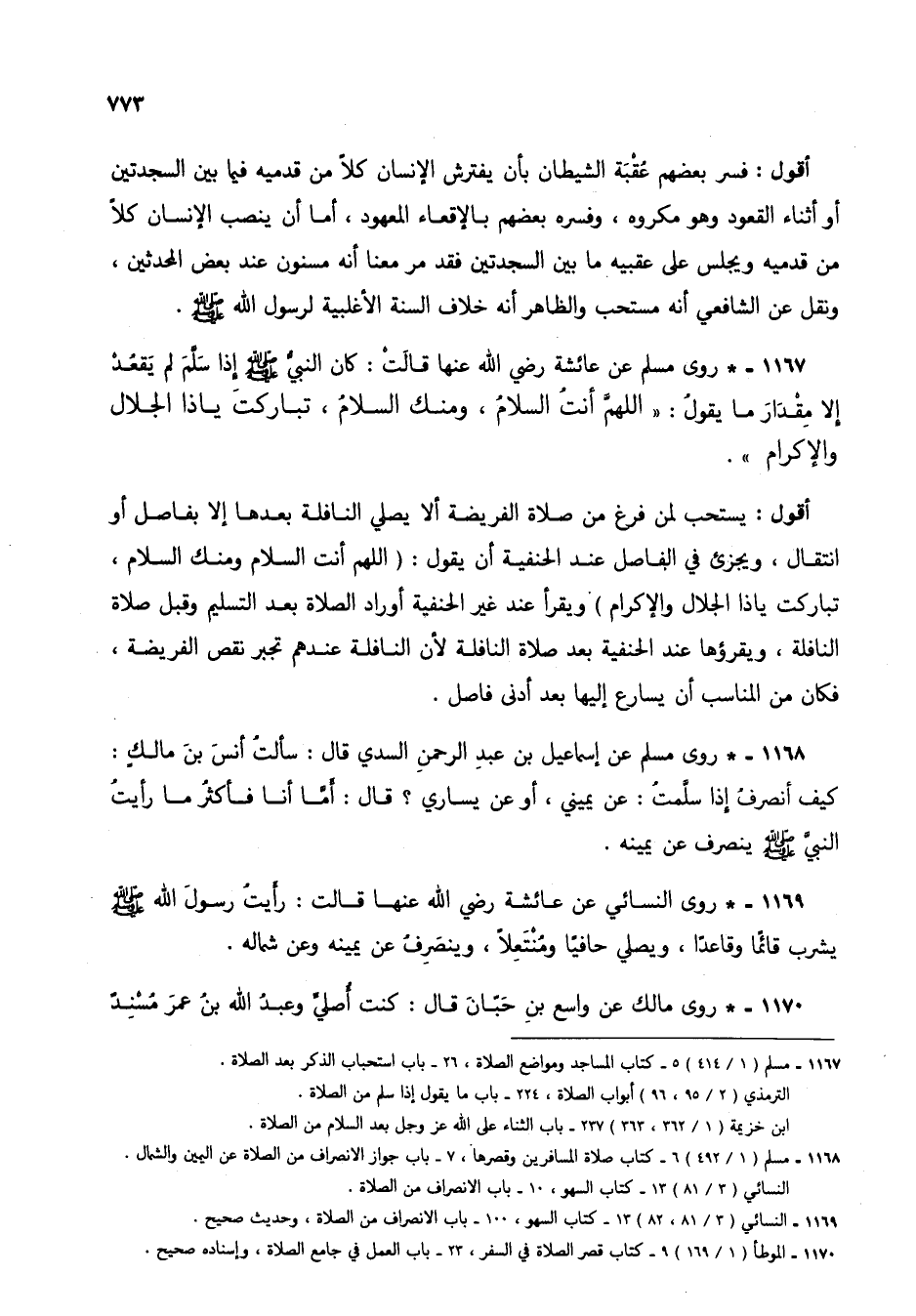 1167 - * روى مسلم عن عائشة رضي الله عنها قالت: كان النبي صلى الله عليه وسلم إذا سلم لم يقعد إلا مقدار ما يقول: "اللهم أنت السلام، ومنك السلام، تباركت يا ذا الجلال والإكرام".