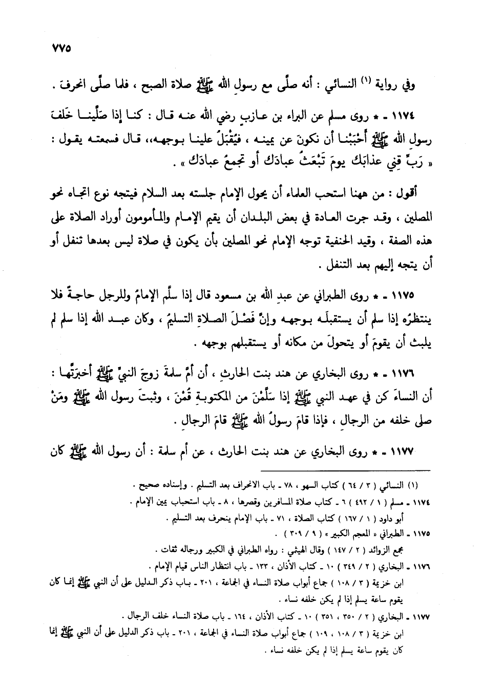 1175 - * رو الطبراني عن عبد الله بن مسعود قال إذا سلم الإمام وللرجل حاجة فلا ينتظره إذا سلم أن يستقبله بوجهه وإن فصل الصلاة التسليم، وكان عبد الله إذا سلم لم يلبث أن يقوم أو يتحول من مكانه أو يستقبلهم بوجهه.