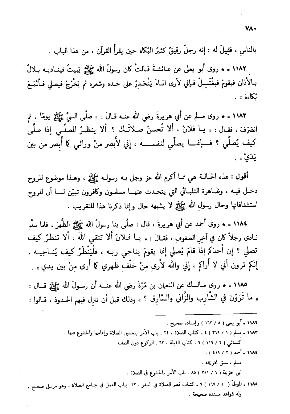 1183 - * روى مسلم عن أبي هريرة رضي الله عنه قال: "صلى النبي صلى الله عليه وسلم يوماً، ثم انصرف، فقال: "يا فلان، ألا تحسن صلاتك؟ ألا ينظر المصلي إذا صلى كيف يصلي؟ فإنما يصلي لنفسه، إني لأبصر من ورائي كما أبصر من بين يدي".