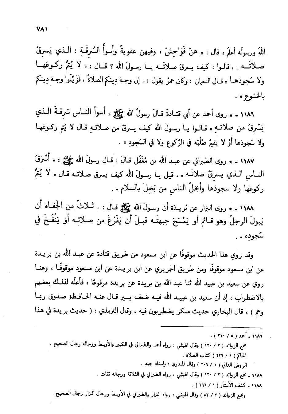 1187 - * روى الطبراني عن عبد الله بن مغفل قال: قال رسول الله صلى الله عليه وسلم: "أسرق الناس الذي يسرق صلاته"، قيل يا رسول الله كيف يسرق صلاته قال "لا يتم ركوعها ولا سجودها وأبخل الناس من بخل بالسلام".