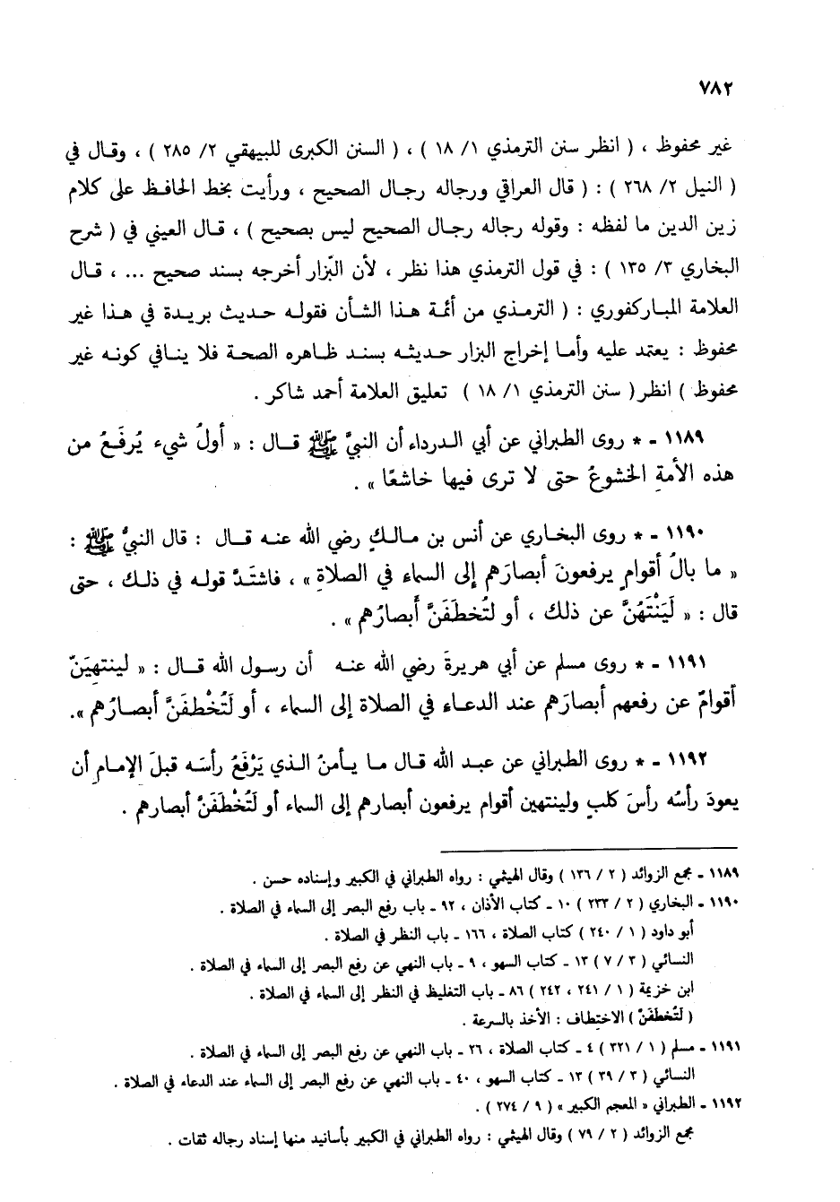 1190 - البخاري (2/ 233) 10 - كتاب الأذان، 92 - باب رفع البصر إلى السماء في الصلاة.