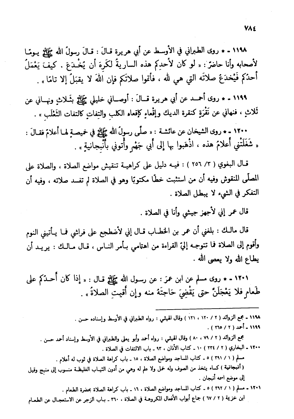 1200 - * روى الشيخان عن عائشة: "صلى رسول الله صلى الله عليه وسلم في خميصة لها أعلام فقال: "شغلتني أعلام هذه، اذهبوا بها إلى أبي جهم وأتوني بأنبجانية".