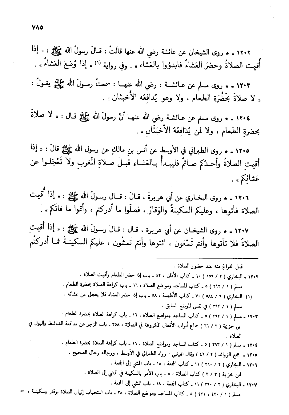 1204 - * روى مسلم عن عائشة رضي الله عنها أن رسول الله صلى الله عليه وسلم قال: "لا صلاة بحضرة الطعام، ولا لمن يدافعه الأخبثان".