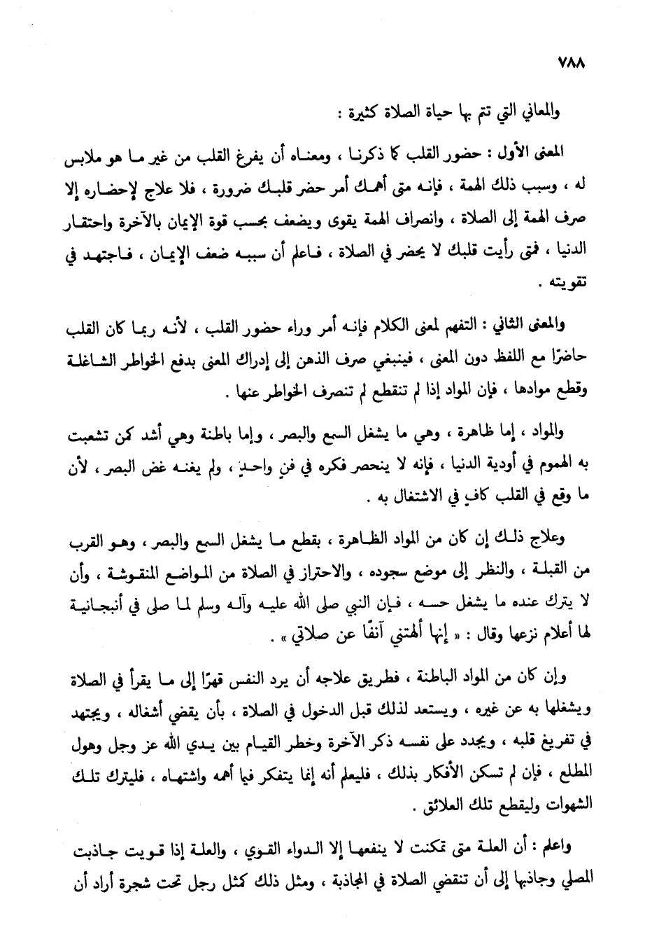 واعلم: أن العلة متى تمكنت لا ينفعها إلا الدواء القوي، والعلة إذا قويت جاذبت المصلي وجاذبها إلى أن تنقضي الصلاة في المجاذبة، ومثل ذلك كمثل رجل تحت شجرة أراد أن