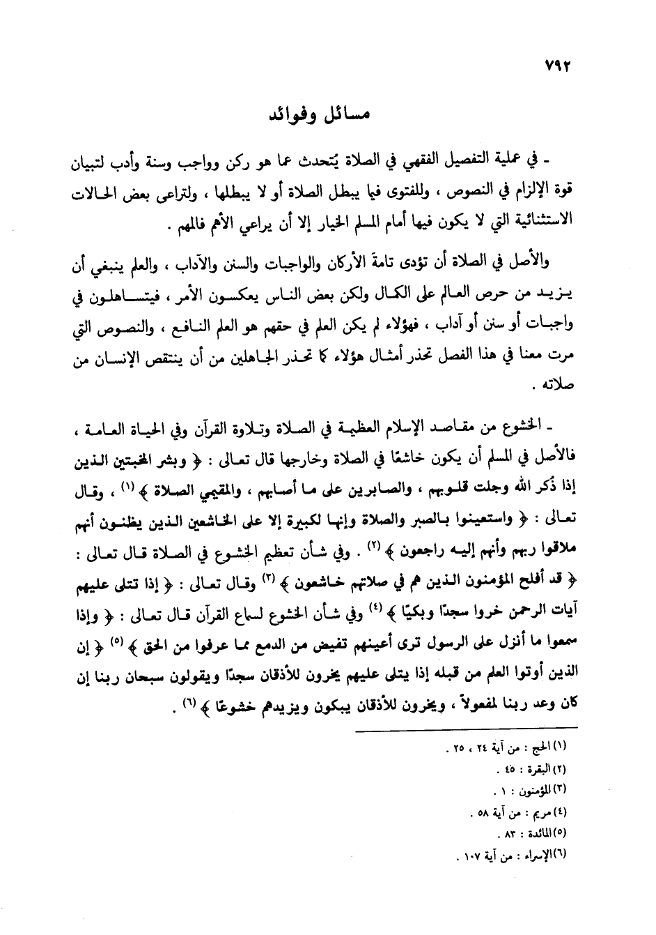 - الخشوع من مقاصد الإسلام العظيمة في الصلاة وتلاوة القرآن وفي الحياة العامة، فالأصل في المسلم أن يكون خاشعاً في الصلاة وخارجها قال تعالى: (وبشر المخبتين الذين إذا ذكر الله وجلت قلوبهم، والصابرين على ما أصابهم، والمقيمي الصلاة) (1)، وقال تعالى: (واستعينوا بالصبر والصلاة وإنها لكبيرة إلا على الخاشعين الذين يظنون أنهم ملاقوا ربهم وأنهم إليه راجعون) (2). وفي شأن تعظيم الخشوع في الصلاة قال تعالى: (قد أفلح المؤمنون الذين هم في صلاتهم خاشعون) (3) وقال تعالى: (إذا تتلى عليهم آيات الرحمن خرجوا سجداً وبكياً) (4) وفي شأن الخشوع لسماع القرآن قال تعالى: (وإذا سمعوا ما أنزل على الرسول ترى أعينهم تفيض من الدمع مما عرفوا من الحق) (5) (إن الذين أوتوا العلم من قبله إذا يتلى عليهم يخرون للأذقان سجداً ويقولون سبحان ربنا إن كان وعد ربنا لمفعولاً، ويخرون للأذقان يبكون ويزيدهم خشوعاً) (6).