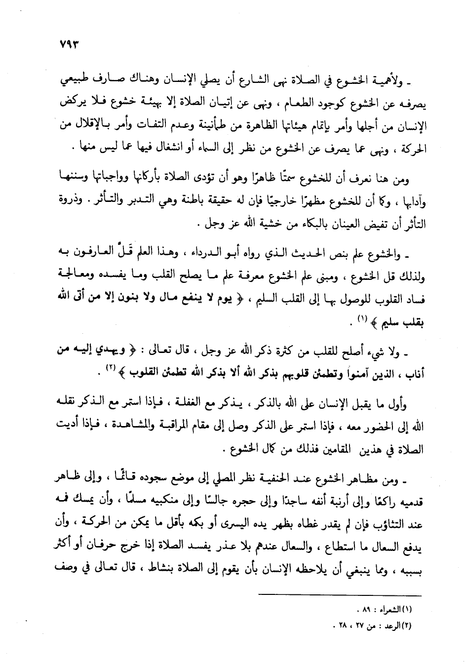 - والخشوع علم بنص الحديث الذي رواه أبو الدرداء، وهذا العلم قل العارفون به ولذلك قل الخشوع، ومبنى علم الخشوع معرفة علم ما يصلح القلب وما يفسده ومعالجة فساد القلوب للوصول بها إلى القلب السليم، (يوم لا ينفع مال ولا بنون إلا من أتى الله بقلب سليم) (1).