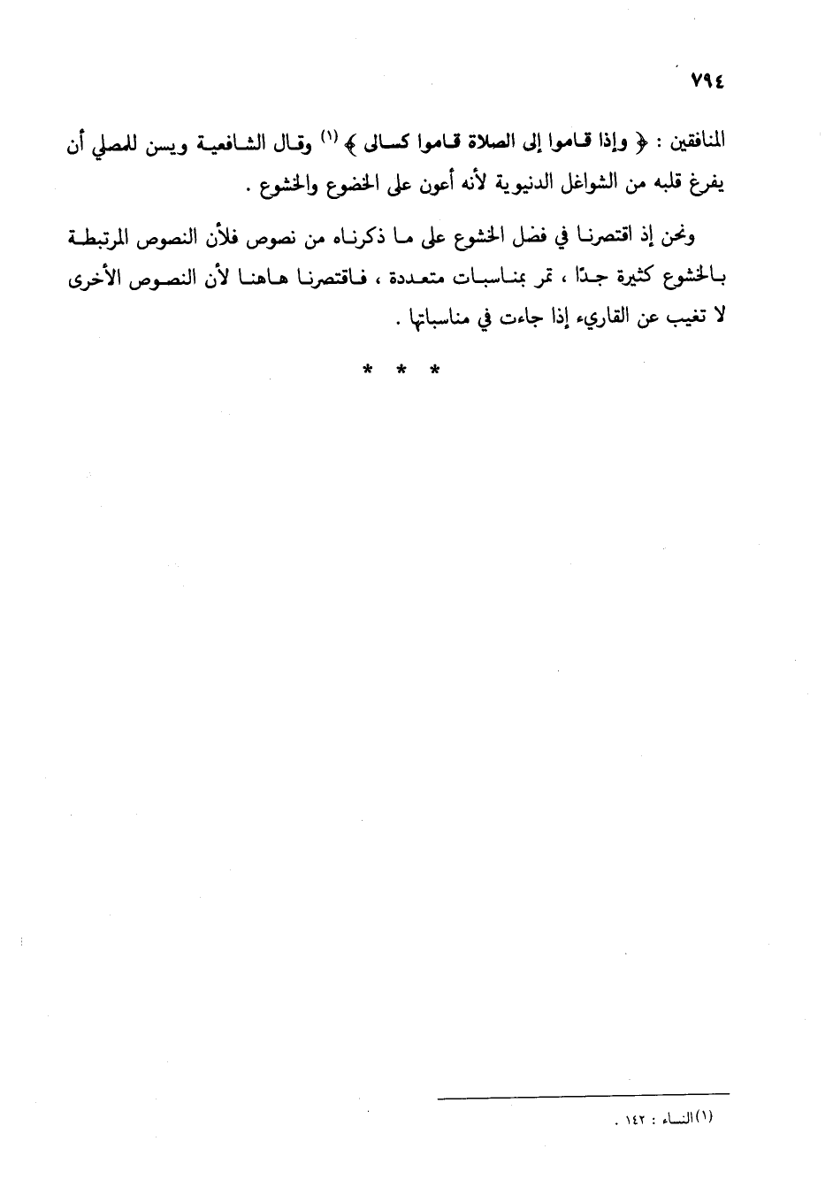 المنافقين: (وإذا قاموا إلى الصلاة قاموا كسالى) (1) وقال الشافعية ويسن للمصلي أن يفرغ قلبه من الشواغل الدنيوية لأنه أعون على الخضوع والخشوع.