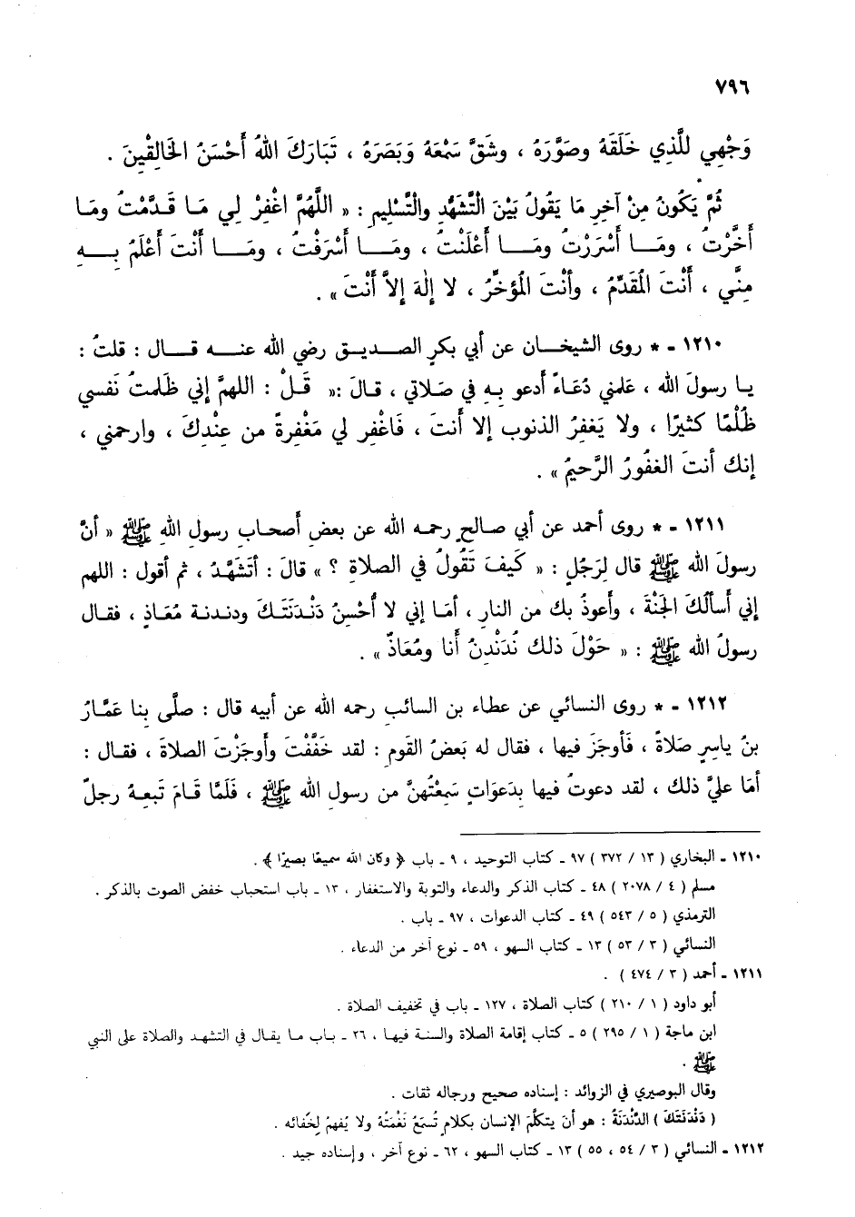 1210 - * روى الشيخان عن أبي بكر الصديق رضي الله عنه قال: قلت: يا رسول الله، علمني دعاء أدعو به في صلاتي، قال: "قل: اللهم إني ظلمت نفسي ظلماً كثيراً، ولا يغفر الذنوب إلا أنت، فاغفر لي مغفرة من عندك، وارحمني، إنك أنت الغفور الرحيم".