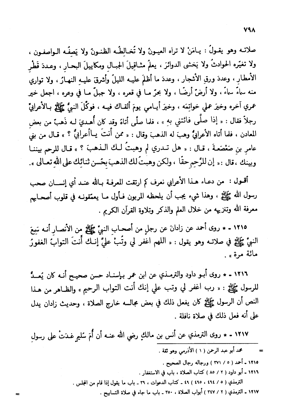 1216 - * روى أبو داود والترمذي عن ابن عمر بإسناد حسن صحيح أنه كان يعد للرسول صلى الله عليه وسلم: "رب اغفر لي وتب علي إنك أنت التواب الرحيم" والظاهر من هذا النص أن الرسول صلى الله عليه وسلم كان يفعل ذلك في بعض مجالسه خارج الصلاة، وحديث زادان يدل على أنه فعل ذلك في صلاة نافلة.